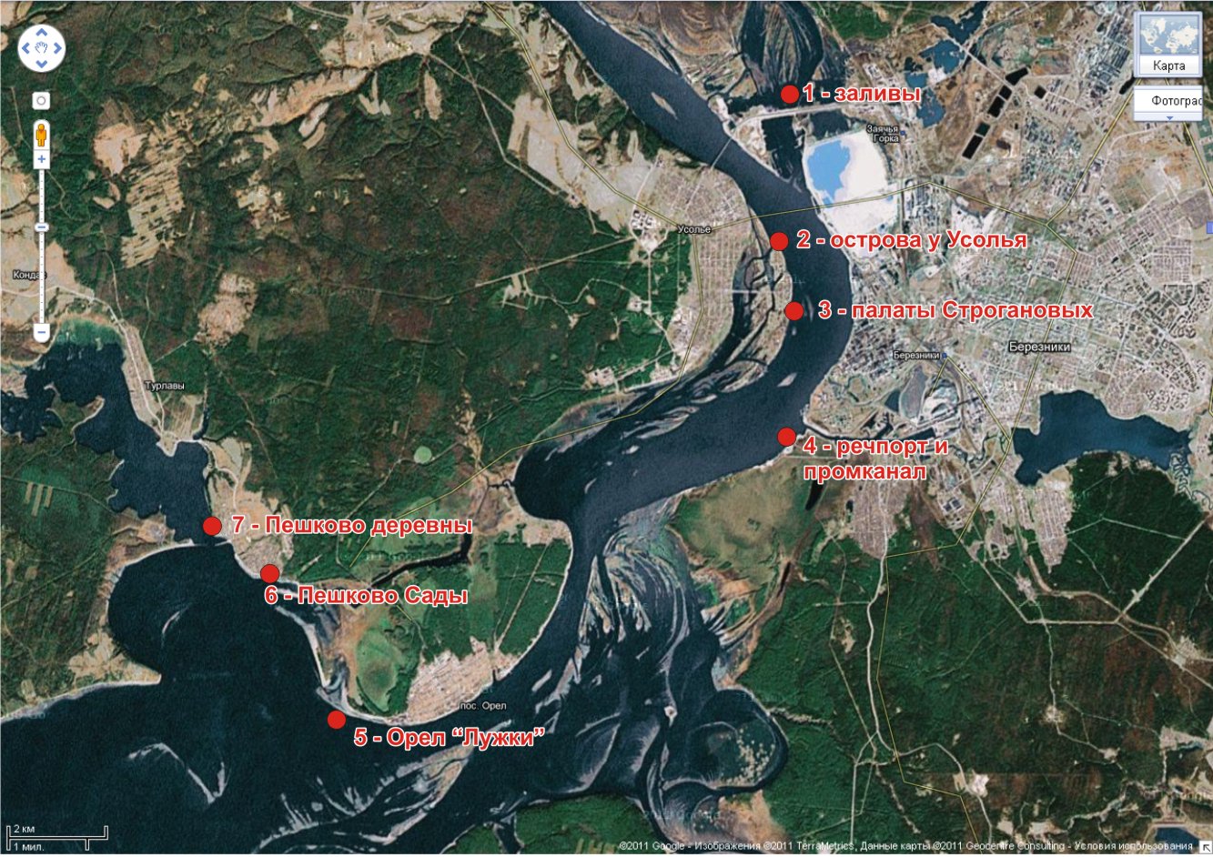 KPS Опубликовано 27 апреля, 2011 Опубликовано 27 апреля, 2011 Спасибо за развернутый ответ. Лет 15 назад в Березниках занимался парусным спортом, ну и винд мне понравился. Лет 5 вынашивал мечту приобрести винд. В прошлом году появились маленько финансы, 4 месяца искал виндсерфинг б/у, нашел в Казани. За ним ездил, но это другая история. В ходе опыта полученного прошлым летом я заметил, что летом дуют в основном северные ветра и хорошее место ходить на заливах справа от дамбы или справа у моста, но выше по течению острава с кустами и деревьями и ветер идет прерывистых, а у берегов как и ты говорил ветровые тени. В этом сезоне ищу места, чтоб с севера км 2-3 было свободное пространство, пока приметил южный берег промканала при входе его в каму, также рыбаки мне посоветовали ходить в районе верхних и нижних новинок (верх по течению от моста) там говорят берега крутые и ветер как в аэродинамической трубе, попробуйте сами. Скайт хорошо, но вам нужен крепкий ветер, а мне хватит и 2 бала, но уже подумываю о приобретении, буду когда ветер слабый на винте ходить, если крепкий то на скайте летать. у моста продувает в основном запад и восток. у промканала можно попробовать, но посколку тебе не надо места чтобы раскладыаться, как нам, то удобнее будет в Усолье у палат Строгановых. И спуск в воду удобный и подьезд. В зависимости от направления можно уехать выше по реке на остров. За Новинки, не думаю, чтоб там удобно было. Берега высокие, река достаточно узкая. при идеальном совпадении направления реки и ветра будет хорошо, чуть ветер зашел в сторону и усе. Вот карта примерная со спотами. В принципе все катабельно и проверено. По направлению все из карты понятно. ' alt=''>
