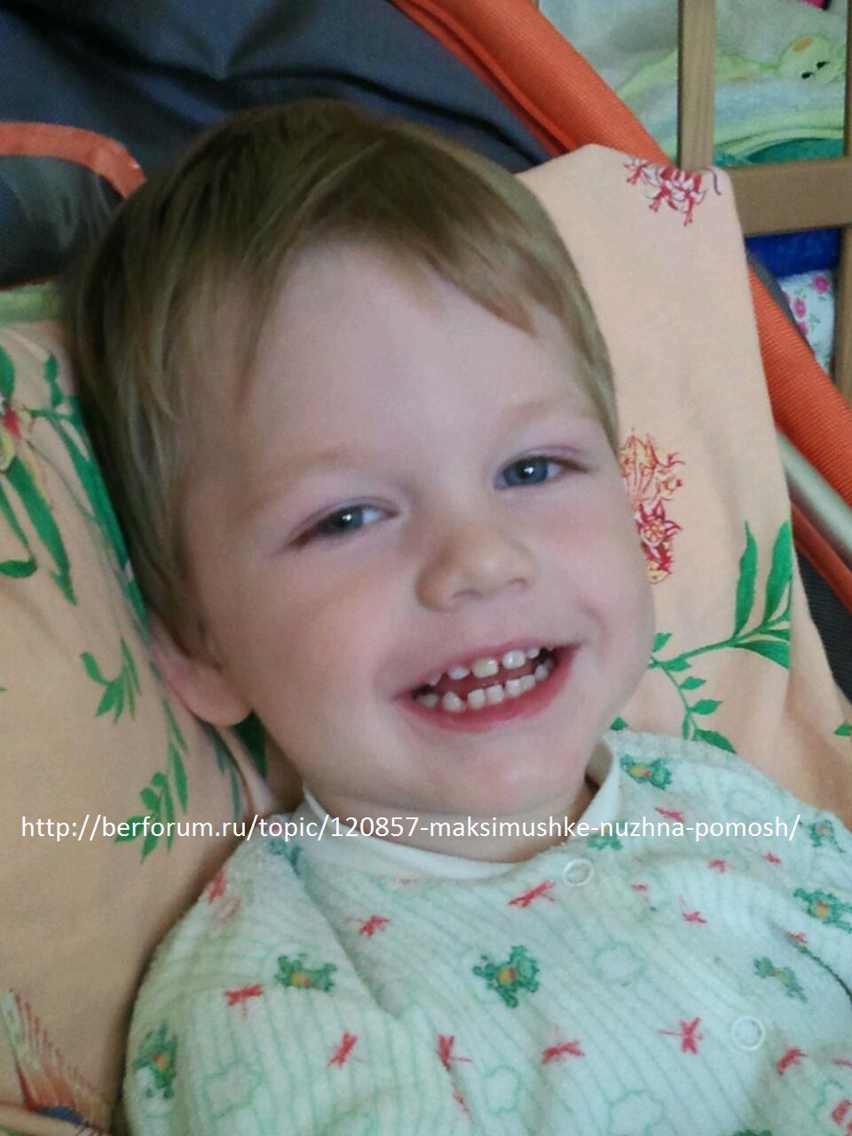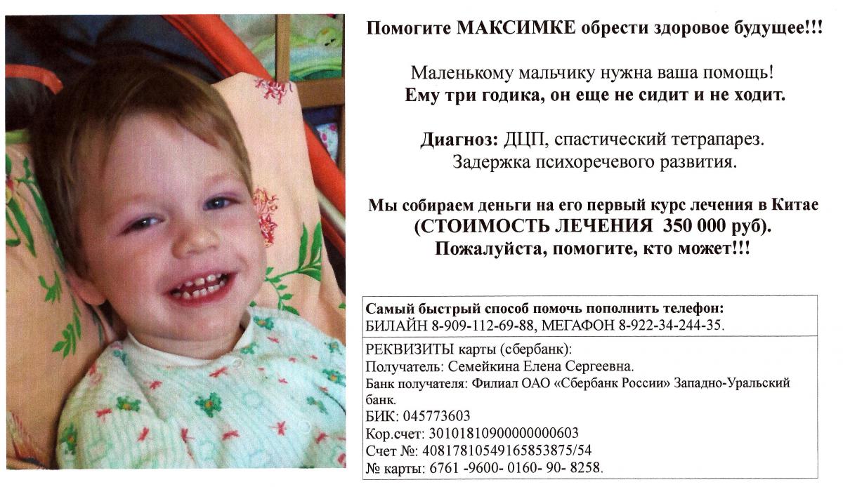 Елена Семейкина. Опубликовано 14 октября, 2012 Опубликовано 14 октября, 2012 Помогите МАКСИМКЕ обрести здоровое будущее!!! Связаться с мамой Максима можно по тел. 8-922-30-95-203. Здравствуйте! Маленькому мальчику нужна ваша помощь! Ему три годика, он еще не сидит и не ходит. Любая помощь важна! Протяните свою руку помощи маленькому человечику, который благодаря вашей поддержке сможет иметь шанс на полноценную жизнь! Мы собираем деньги на его первый курс лечения в Китае (стоимость лечения 350 000 руб). Для достижения максимального результата рекомендуется пройти минимум 5 курсов. Нам нужна Ваша помощь! Пожалуйста, помогите, кто может!!! Внесите свой вклад - денежной помощью или просто распространением информации. Вместе мы можем помочь Максимушке осуществить его мечту... Все полученные средства несут целевое использование: дорога, лекарства, реабилитация, лечение, проживание и питание. Самый быстрый способ помочь: пополнить телефон: БИЛАЙН 8-909-112-69-88, МЕГАФОН 8-922-34-244-35. РЕКВИЗИТЫ карты (сбербанк): Получатель: Семейкина Елена Сергеевна. Банк получателя: Филиал ОАО «Сбербанк России» Западно-Уральский банк. БИК: 045773603 Кор.счет: 30101810900000000603 Счет №: 40817810549165853875/54 № карты: 6761 -9600- 0160- 90- 8258. Заранее, огромное спасибо!!! Храни Вас Господь!!! Диагноз: ДЦП, спастический тетрапарез. Задержка психоречевого развития. Информацию о Максимке можно узнать на: http://maksimka.a5.ru/ http://www.facebook....17479331683083/ http://www.odnoklass.../56403922255905 http://vk.com/club42755696 http://www.bermama.r...972.html#166702 http://perm.kp.ru/daily/25968/2905907/ статья в "Комсомольской правде" http://zwezda.perm.r...paper/?pub=9173 статья в газете "Звезда" ОТЧЕТ О ПОСТУПЛЕНИЯХ: 9.09.12 принято 99.19 р. (мегафон). 10.09.12 принято 100 руб. (билайн). 10.09.12 принято 150 руб. (билайн). 12.09.12 принято 2790 руб. (билайн). 13.09.12 принято 300 руб. (мегафон). 18.09.12 принято 500 руб. (билайн). СПАСИБО ВАМ ОГРОМНОЕ!!! 29.09.12 принято 1000 руб. (билайн). 26.09.12 собрано 4 208 РУБ. (благотворительный аукцион в Оранж Молле). 28.09.12 принято 300 руб. (билайн). 01.10.12 зачислено 800 руб. (Сбербанк). 01.10.12 зачислено 200 руб. (Сбербанк). 02.10.12 зачислено 350 руб. (Сбербанк). СПАСИБО ВСЕМ ОГРОМНОЕ!!! 3.10.12 принято 100 руб. (Сбербанк). 3.10.12 принято 50 руб. (Мегафон). 3.10.12 принято 100 руб. (Билайн). 3.10.12 принято 1000 руб. (Билайн). 3.10.12 оказана спонсорская помощь в сумме 50 000 руб. 3.10.12 принято 150 руб. (Билайн). 4.10.12 принято 50 руб. (Билайн). 4.10.12 принято 200 руб. (Билайн) 4.10.12 принято 200 руб. (Билайн). 4.10.12 принято 1000 руб. (Билайн). 4.10.12 принято 100 руб. (Билайн). 4.10.12 принято 1000 руб. (Билайн). 4.10.12 принято 100 руб. (Мегафон). 4.10.12 принято 1000 руб. (Сбербанк). 4.10.12 принято 200 руб. (Сбербанк). 5.10.12 принято 1000 руб. (Сбербанк). 5.10.12 принято 400 руб. (Билайн). 5.10.12 принято 285.17 руб. (Билайн). 6.10.12 принято 500 руб. (Билайн). 6.10.12 принято 250 руб. (Билайн). 7.10.12 принято 100 руб. (Сбербанк). 7.10.12 принято 300 руб. (Мегафон). 8.10.12 принято 500 руб. (мегафон). 8.10.12 принято 700 руб. (билайн). 8.10.12 принято 150 руб. (билайн). 8.10.12 принято 400 руб. (билайн). 8.10.12 принято 460 руб. (сбербанк). 8.10.12 принято 1100 руб. (сбербанк). 9.10.12 принято 250 руб. сбербанк, 200 руб. билайн, 300 руб. билайн, 200 руб. мегафон. 10.10.12 принято 200 руб. сбербанк, 300 руб. сбербанк, 200 руб. сбербанк, 500 руб. сбербанк, 250 руб. сбербанк, 100 руб. билайн. 11.10.12 принято 100 руб. сбербанк, 600 руб. сбербанк, 100 руб. сбербанк, 2000 руб. сбербанк, 100 руб. билайн, 95 руб. билайн, 100 руб. билайн, 300 руб. билайн, 500 руб. билайн, 200 руб. билайн, 100 руб. билайн, 300 руб. билайн, 300 руб. билайн. 12.10.12 принято 200 руб. сбербанк, 100 руб. мегафон, 47 руб. билайн, 500 руб. билайн, 500 руб. билайн