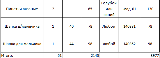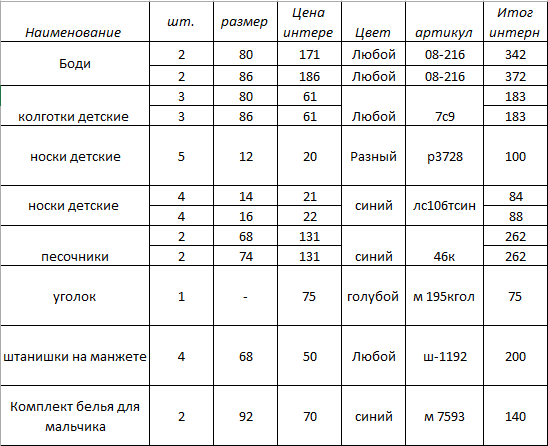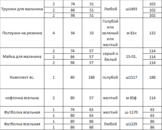 rover Опубликовано 22 ноября, 2014 Автор Опубликовано 22 ноября, 2014 Заказываю: Трусики для мальчика Артикул: ш1493 51 руб. размер 86 3шт. (если можно, то разных расцветок), Майка для мальчика Артикул: 13-01 57 руб. размер 86 2шт. (если можно, то разных расцветок), Комплект для мальчика Артикул: ш1475 104 руб. размер 74 1шт, Пижама для мальчика Артикул: ш1428фт 187 руб. размер 80 2шт. (если можно, то разных расцветок). Спасибо. Добрый вечер! Ага , Ваш заказ принят.. напишите , пожалуйста , Ваш номер телефона..