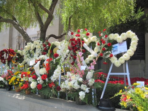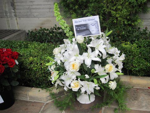 LЁLЯ Опубликовано 12 июля, 2010 Опубликовано 12 июля, 2010 Цветы от российских фанатов на Forest Lawn к 25 июля: Венок: Правда,очень сложно отыскать наш венок среди нескольких похожих,можно было бы по открытке,но издалека не разобрать... Открытка к нему: Букет: Открытка к нему,которая,к сожалению,была у них распечатана чёрно-белой... Москва 25 июня: