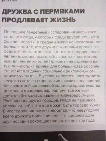 RomanIzrailevich Опубликовано 19 августа, 2015 Опубликовано 19 августа, 2015 :D Ходит по инету. Юмор. И приятно)) Дружба с пермяками продлевает жизнь Последние гендерные исследования указывают на то, что люди, у которых среди друзей есть хотя бы один пермяк, в среднем живут на несколько лет дольше, чем те, кто дружит с жителями прочих городов. Пермяки для большинства россиян становятся ходячей социальной рекламой, - отмечают ученые. - В условиях постоянного экологического гнета со стороны химических предприятий, безграмотной социальной политике правительства региона и мизерных зарплатах они все же умудряются быть счастливыми и жизнерадостными. Россияне из других городов, глядя на пермяков, убеждают себя, что все может быть гораздо хуже". В исследовании также говорится, что невыгоднее всего дружить с москвичами - в среднем, один друг-москвич сокращает жизнь на два-три года. 4