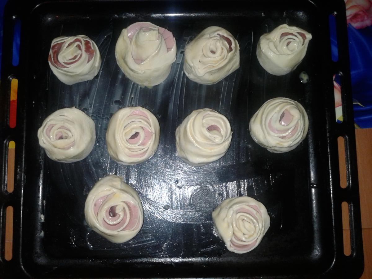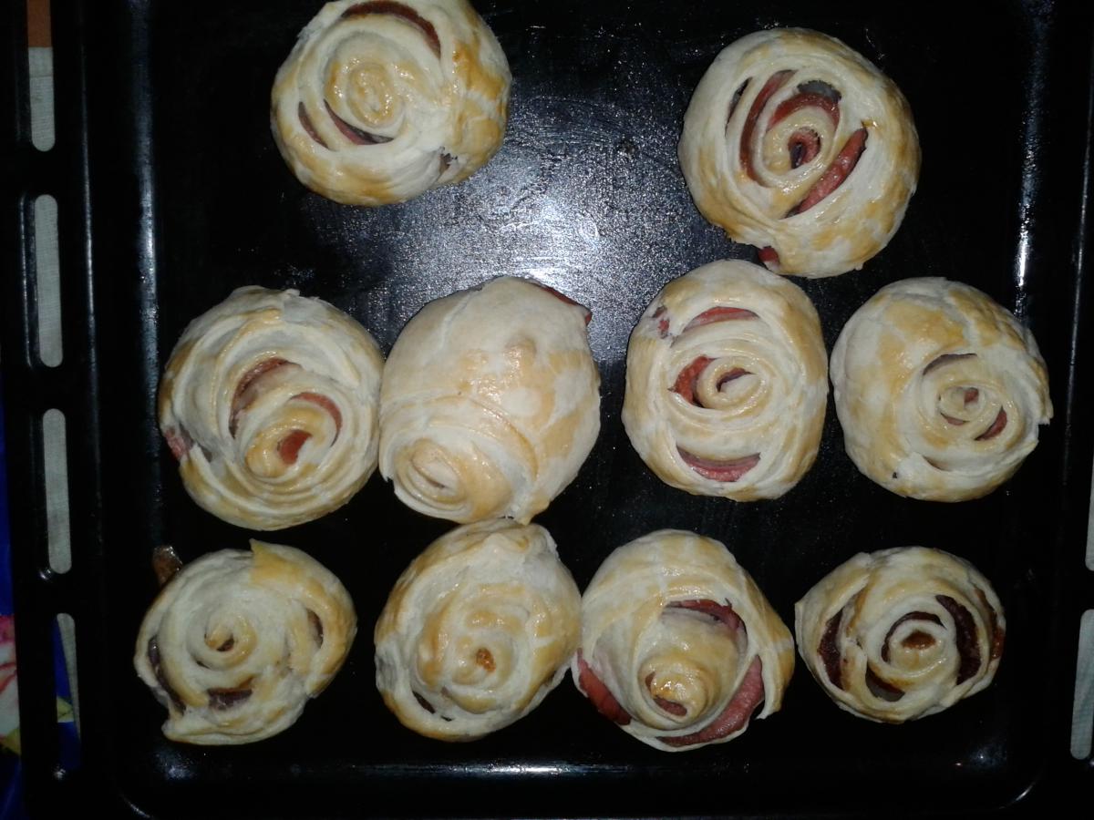 Ирэн Опубликовано 6 октября, 2012 Автор Опубликовано 6 октября, 2012 Решила побаловаться плюшками (рецепт подсмотрен в инете) берем тесто слоеное,раскатываем: нарезаем колбаску тоненькими ломтиками и выкладываем на тесто отрезаем по низу и начинаем закручивать вот такие "цветочки" получились минут на 20-30 в разогретую духовку (я смазывала яйцом),и в итоге: