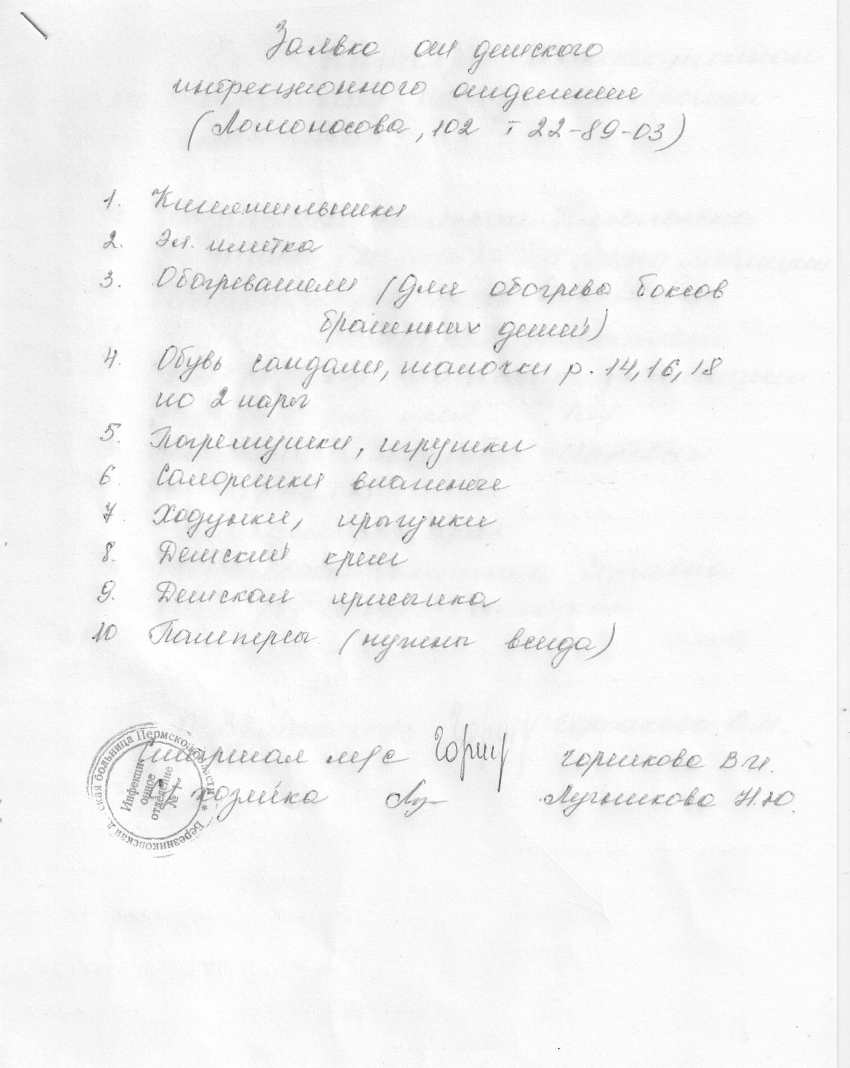 Ирэн Опубликовано 4 сентября, 2009 Опубликовано 4 сентября, 2009 Вот что у нас попросили: Информация по детям: - Валерия-3г.10 м. (выглядит на 2 года) - Андрей(брат Валерии)-2 года (вчера был день рождения,выглядит на 1 год) - Александр-2 года - Снежанна-1 месяц(отказница) Детишек постарше готовят в детский дом. Лежать в отделении они будут месяца 3. Дети плохо ходят,очень маленькие. Не умеют пользоваться горшком.