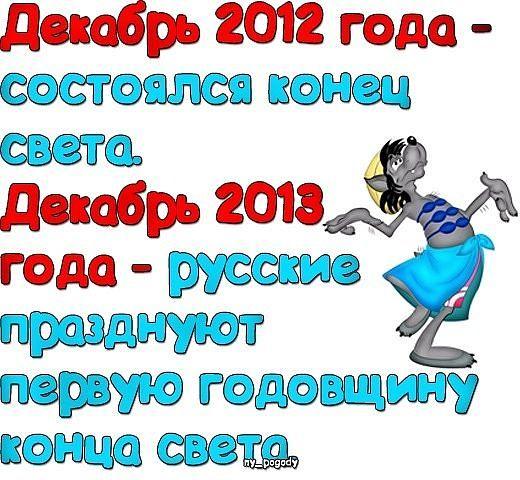 Местная Опубликовано 29 ноября, 2012 Опубликовано 29 ноября, 2012 Нужен флешмоб 22-го под лозунгом типа - День энергетика победил конец света. С яркой иллюминацией. :) Т.е. на 21-е организуем флешмоб "Боимся вместе" (прям "Дрожь Земли" видицца мне), а на 22-е для тех, кто еще на ногах держится, - "День энергетика победил конец света", (или "Чубайс рулит")... Насыщенные выходные наклевываются... Зампред комитета по науке и наукоёмким технологиям Михаил Дегтярёв из ЛДПР рассказал «Известиям», что советовался с академиками, учёными и поэтому ответственно опровергает апокалипсис в декабре 2012 года. Значит, сам-то сомневался...