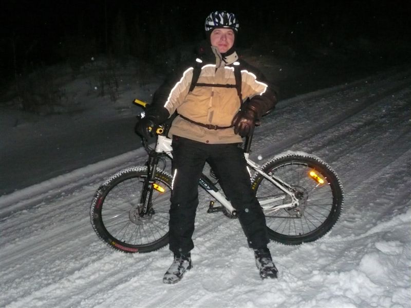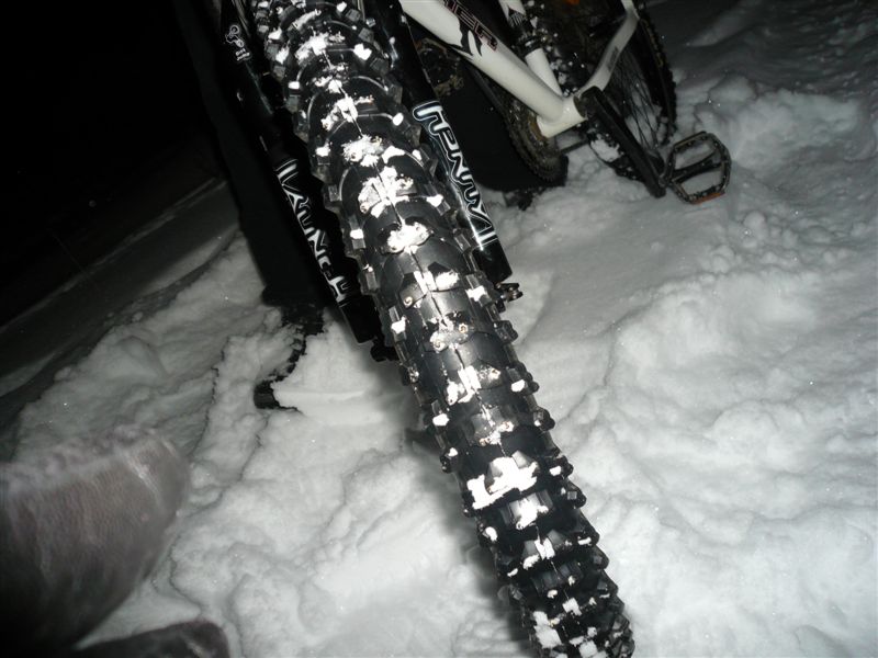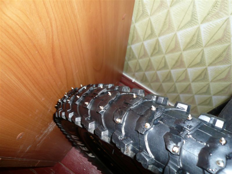 Sanchos Опубликовано 10 ноября, 2009 Опубликовано 10 ноября, 2009 Итак, нападавшись вдоволь с велика во время покатушки после первого снега, я принял окончательное решение самому зашиповать свои покрышки с помошью испытанного и проверенного спосба-с помощью саморезов. После подробной консультации со специалистом приобрёл саморезы универсальные 4х12 мм, в количестве 320 штук. С помощью шила прокалывал снаружи грунтозацепы, и в эти отверстия изнутри вкручивал саморезы. В конце обклеил изнутри покрышку скотчем, чтобы их шляпки не повредили камеру. Скотч не пожелал прилипать к резине, и пришлось промазывать его клеем. На всю работу у меня ушло ТРИ дня. Да-да! Работа эта нудная и кропотливая, и если хочешь, чтобы результат порадовал качеством и аккуратностью, то потраченное время того стоит!!! )) Мне понадобилось всего лишь это... и куча времени ) Вот что в итоге получилось Сегодня провёл испытания, совместно с Алексом По укатанному снегу вел идёт практически как по асфальту, но если есть припорошенные снегом участки, то уже чуть хуже, а если снега ещё больше, то заносит...видимо всё же скажывается то, что резина летняя.
