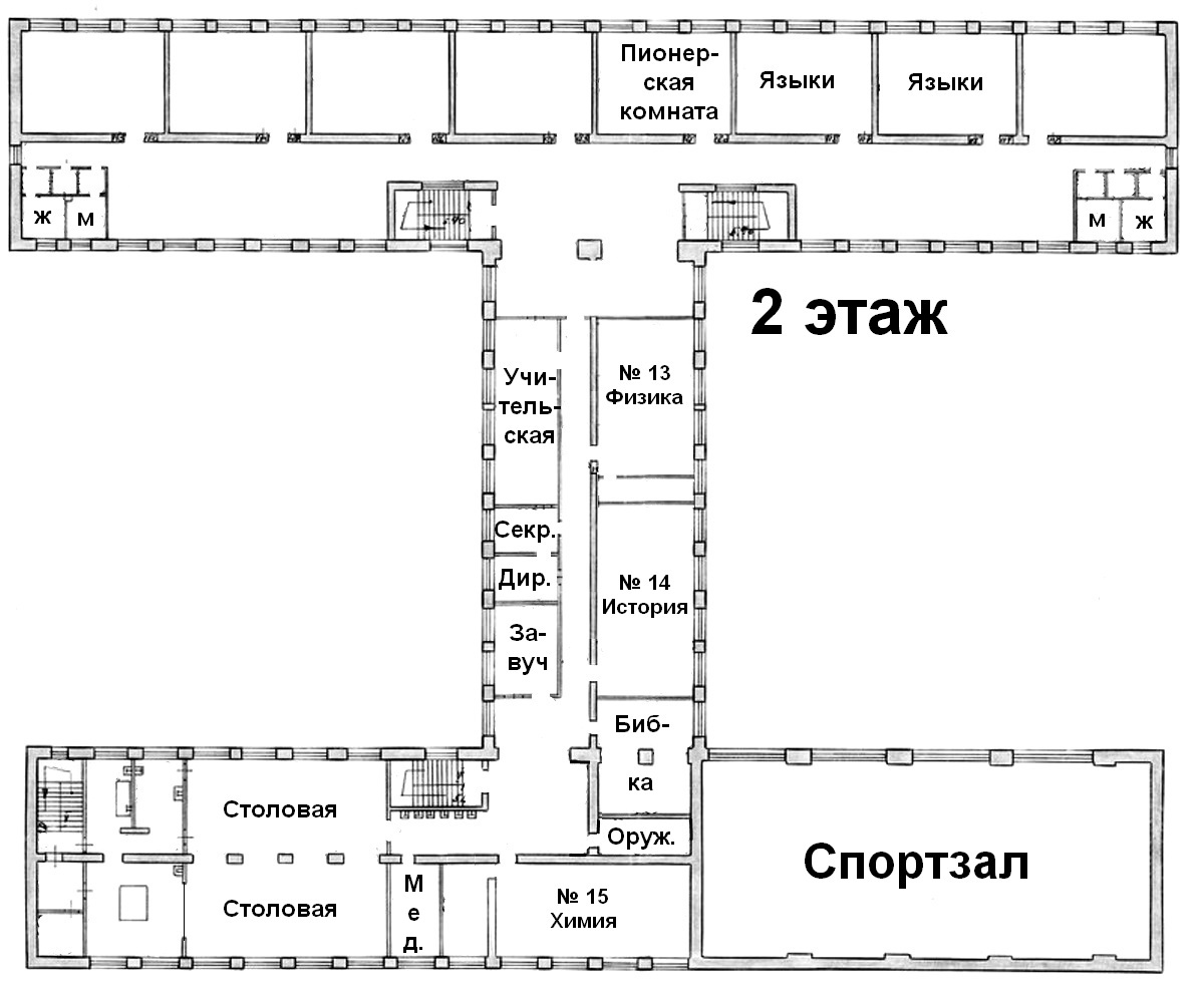 tany Опубликовано 25 декабря, 2012 Опубликовано 25 декабря, 2012 Хочешь сказать, что у Зав ВР был огромный кабинет размером с класс? Вот такое дело нашлось в альбоме Школы №12 из музея Дома Учителя. Но на ней не видно истинного масштаба помещения. Я всегда "видел" его небольшим, так как где-то в этом месте был ещё кабинет то ли изо, то ли младшей алгебры, которую вел Крохалев. Кабинет был, действительно, размером с класс.. Собирался там комитет комсомола на заседания, Рядом (левее) был кабинат математики (Крохалева ВД) Вот такой я помню Антонину Васильевну Четверикову...как на фото... преподавала географию... Скуки ради решил карту школы нарисовать из того, что помнил. Нашел проект нашей школы (слава всезнающему Интернету!) - был он 2С-02-10 или 2С-02-9 - короче похоже на них. Поэтажка с тематическими кабинетами, которые не забыл. Не смог сообразить, как вписать кабинет Четвериковой (завуч по воспит. работе), который был в проходе в левую рекреацию второго этажа. Там же был кабинет рисования, насколько я помню. Но не помню.