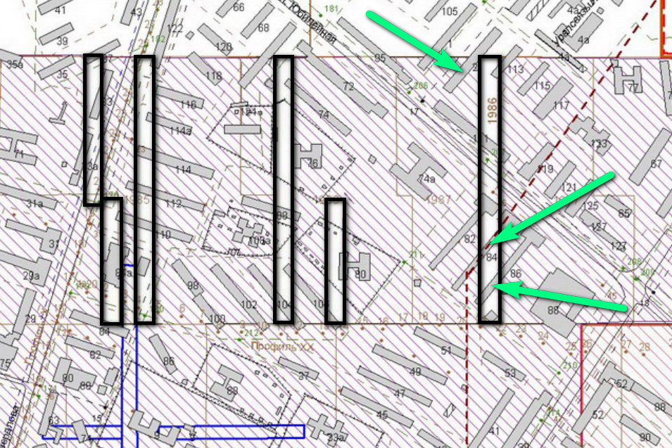 Чёрный прямоугольник справа перекрывает 3 дома из тех, которые признаны аварийными и подлежащими сносу до 01.05.2016 года. (эти три дома указаны зелёными стрелками).