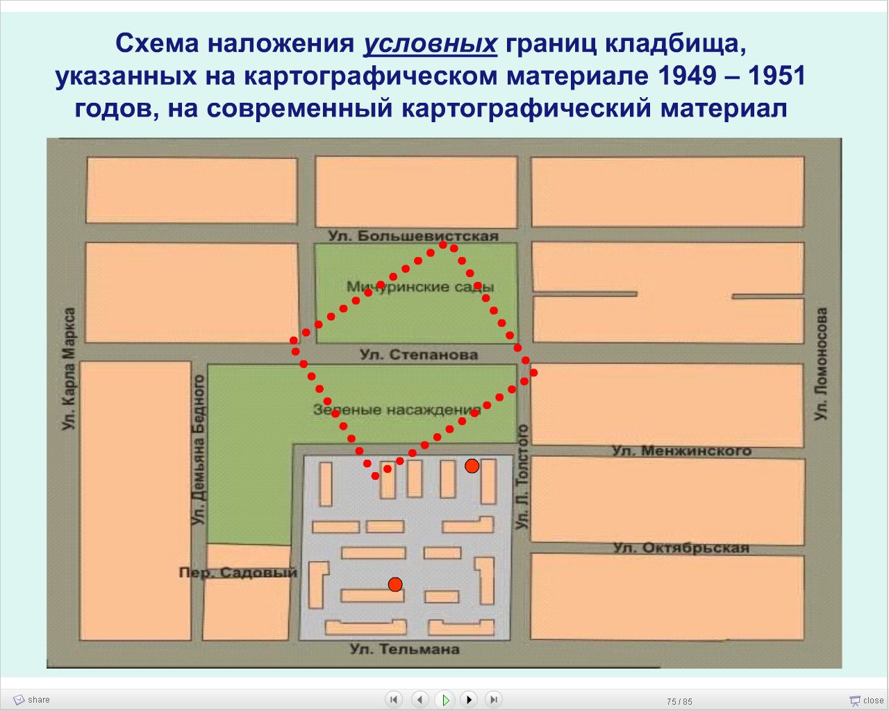 Gh0stD0G Опубликовано 21 ноября, 2009 Опубликовано 21 ноября, 2009 Сегодня попросил отца, тётку и бабушку нарисовать как располагалось кладбище на этом пустыре. Все рисуют треугольник основанием которому служит улица Степанова и вершиной в центре пустыря. Потом показал картинки с наложением из отчета комиссии. Все трое сказали, что прикрепленная картинка больше всего похожа на то, что было в действительности. Дело в том, что через этот пустырь отца водили в детсад и тропинка пересекала его примерно с угла, где пересекаются улицы Д. Бедного и Тельмана и примерно до угла пересечения Толстого/Степанова, а шла тропинка как раз вдоль кладбища.В 50х годах многие могилы уже были в запустении, но еще оствались те за которыми ухаживали. У бабушки, кстати "культурный шок" от статей в калпуловских Брехунках о том, что кладбища на пустыре не было. Так получилось, что она помнит как на этом пустыре в 30-40х годах еще хоронили. Странно тогда зачем они такое количество денег вбахивают в ремонт своего здания. А вдруг там работать станет небезопасно? Получится, что зря "обделывали" фасад здания. Кстати, лучше б премии калийщикам выплатили, чем красоты в кризис наводить)) Думается новую управу отстроить дороже и не факт, что она простоит века из-за просадок :wink: