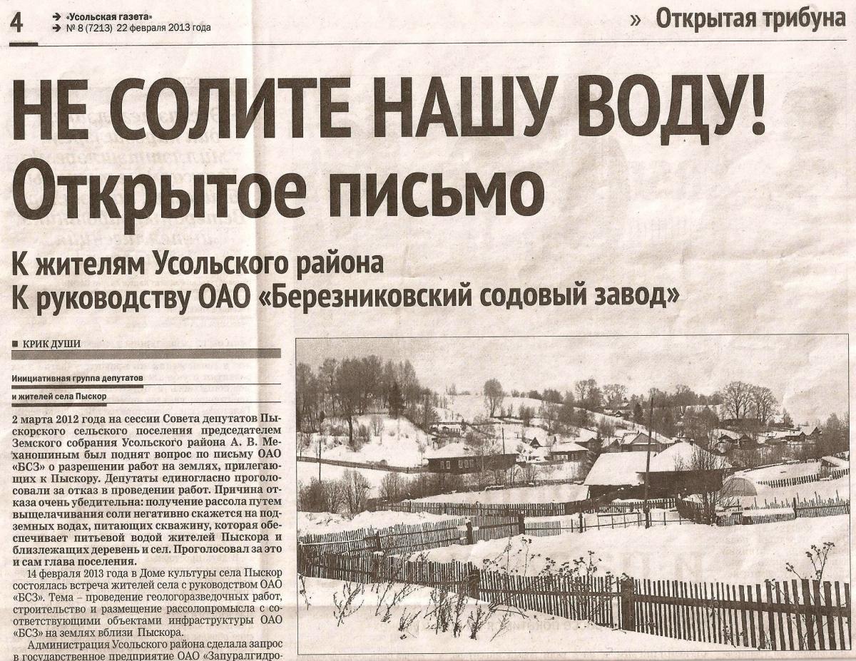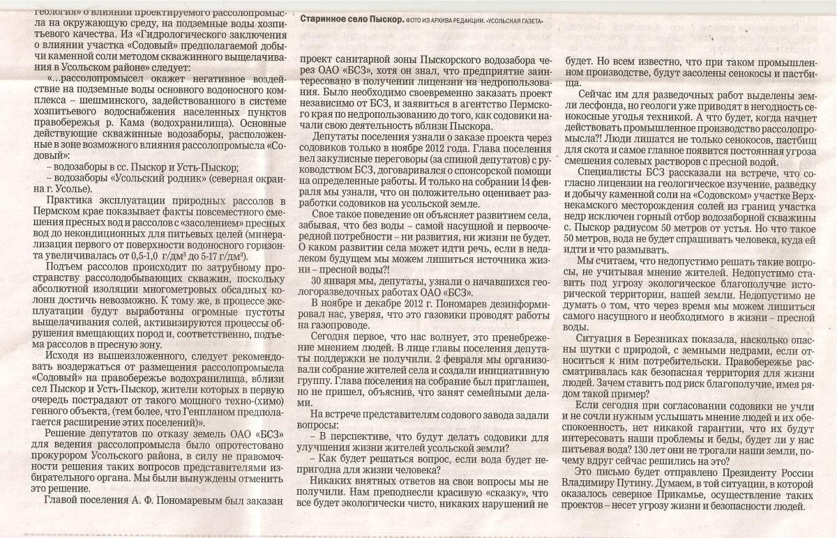 Трубы будут проложены под землей, под мостом. И сейчас рассол подается от БКПРУ-1 по 2 рассолопроводам (которые требуют замены) длиной несколько км. Примерно половина - под землей (от ул. Тельмана до "Автобума"). По воде - так она и сейчас соленая. Нет там запасов грунтовой воды в тех объемах, которые требуются Пыскору (есть ответ от Пермьнедр: да, грунтовая вода - тоже недра). И участок "Содовский" имеет сотни гектар площади. Можно уходить на самую южную точку для добычи, откуда до Пыскора - 3-4 км. Какое влияние на воду от таких скважин? Сегодня там ЛЕС!!! Причем не деловая древесина, а кустарник и мелколесье. Если бы земля была нужна, ее бы Усольский район давно на баланс взял. А так она вообще ничья - была Лесного хозяйства Пермского края. Да несколько лет назад выведена из лесного фонда. И никуда не передана! Позиция "депутатов" Пыскорского поселения такая: сам не ам - и другому не дам. В вопросе не разобрались, а письмо накатали. А разве сейчас есть другие депутаты?