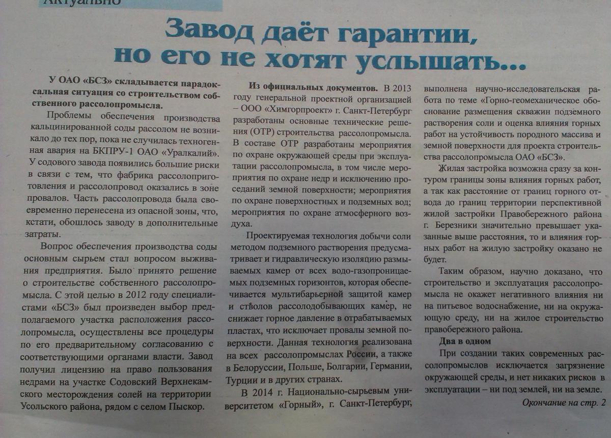 RomanIzrailevich Опубликовано 6 мая, 2014 Автор Опубликовано 6 мая, 2014 http://www.nesekretno.ru/power/22328/Gennadii_Tuhnolobov_V_Bereznikah_ludi_uge_nastradalis часть текста сюда. Время не ждет! Заседание межведомственной комиссии по развитию Березниковско-Соликамского промышленного узла шло не больше двух часов. Судя по неоднозначной реакции зала и повышенному тону выступающих под конец заседания (журналистов не пустили, оставив в коридоре), вопрос дошел все же до рассолопровода, который хочет провести ОАО «Березниковский содовый завод» в скором будущем, чтобы добывать сырье, необходимое им в собственном производстве. Но, по всей видимости, усольчане своего не добьются, сколько бы не возмущались и не настаивали на проведении референдума. Сам председатель правительства Пермского края Геннадий ТУШНОЛОБОВ прокомментировал эту ситуацию так: – Я не могу дать согласие на развитие рассолопромысла. И если будут другие возможности решения этой проблемы, то мы их рассмотрим. Мы всегда аккуратны при рассмотрении проблем, которые связаны с развитием производства и готовы помогать предприятиям, но нас интересует экологическая безопасность этих работ и безопасность людей. В Березниках люди уже настрадались: не один рудник утонул. Если в советские времена эти вопросы решались проще, сейчас намного сложнее. ... что то как то сложно всё... :-k а референдум должен все таки состояться