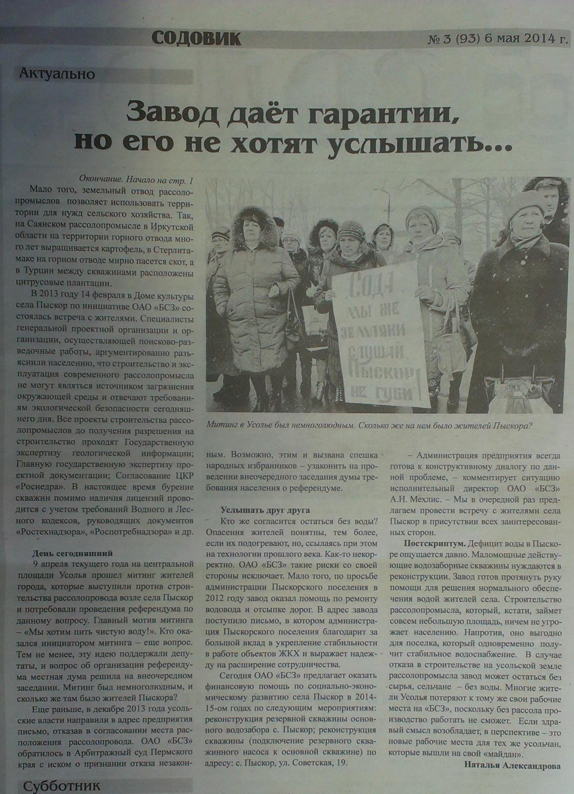 Biz Опубликовано 24 апреля, 2014 Опубликовано 24 апреля, 2014 Усольские депутаты назначили референдум по строительству рассолопровода на 15 июня 2014 г. Усольская городская дума сегодня назначила референдум по вопросу строительства рассолопровода ОАО «Березниковский содовый завод» вблизи поселка Пыскор на 15 июня. Напомним, с инициативой голосования по данной проблеме выступила инициативная группа. Депутаты думы уже утвердили формулировку вопроса, а теризбирком зарегистрировал группу после сбора подписей. Напомним, ранее депутат земсобрания Наталья Овсянникова рассказывала «Ъ», что жители опасаются ухудшения качества питьевой воды в случае строительства рассолопровода. В связи с этим и появилась инициатива проведения референдума. Отметим, что березниковские и усольские власти не дали своего разрешения на размещение рассолопровода. В ответ на это в марте предприятие обратилось в Арбитражный суд Пермского края с заявлением о признании недействительным отказа в согласовании места размещения объекта. Соответствующее письмо власти направили в адрес предприятия в декабре прошлого года. «Ъ»