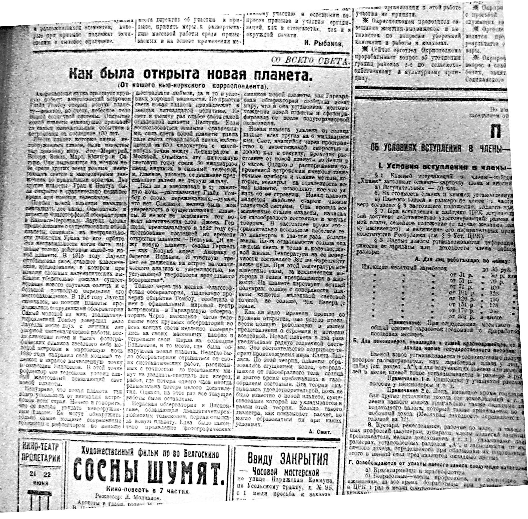 GARRY6491 Опубликовано 23 февраля, 2011 Опубликовано 23 февраля, 2011 Извиняюсь за качество, но так вышло. Статья в местной газете Ударник от 21-6-1930 года об открытии Плутона. От современников. Расшифровывать лень - любители смогут прочитать, надеюсь. =D>