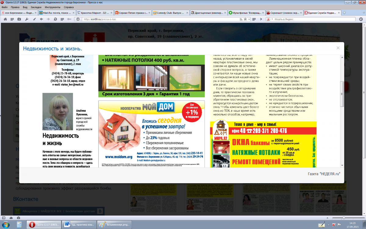 elena.71 Опубликовано 19 августа, 2016 Опубликовано 19 августа, 2016 речь идет об единой службе недвижимости на ГЛАВПОЧТАМТЕ советский проспект д 19. кстати АН до сих пор функционирует --- позор нашим правоохранительным органам. полностью рулила АН Морозова Н,В, (учредитель АН--ее отец Булыга В,Е,) . Под следствием сейчас-- она, ее муж - Дунаев Вячеслав Александрович (бывший газоспасатель на "АВИСМА") и Дмитриев Александр ( польстился на легкие деньги работая в АН ). Эти мужчины полностью попали под ее влияние и криминальные замашки. Ранее, несколько лет, она держала магазины модной женской одежды (фамилия у нее тогда была Золотова )---"Красотка" "Стамбул" "Свадебный сезон" . Под эти магазины она набрала долгов у друзей и в нескольких банках под поручительства друзей семьи и знакомых. Вела шикарный образ жизни бизнес--вумен и ВСЕХ!!!!!!! (как она выражалась модным термином) ---КИНУЛА!!! Ее родители и ее сестры такие ее решения поддержали и вот результат их попустительства-- она от безнаказанности решила ,что "закон ей не писан "и стала решать судьбы людей и их собственность под себя грести.