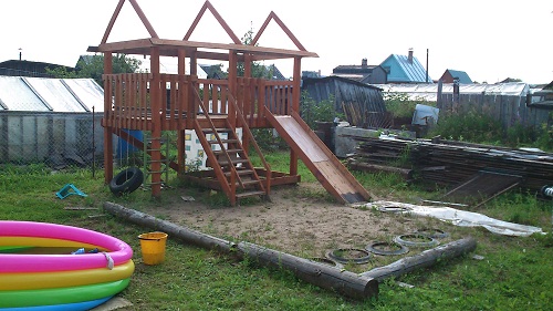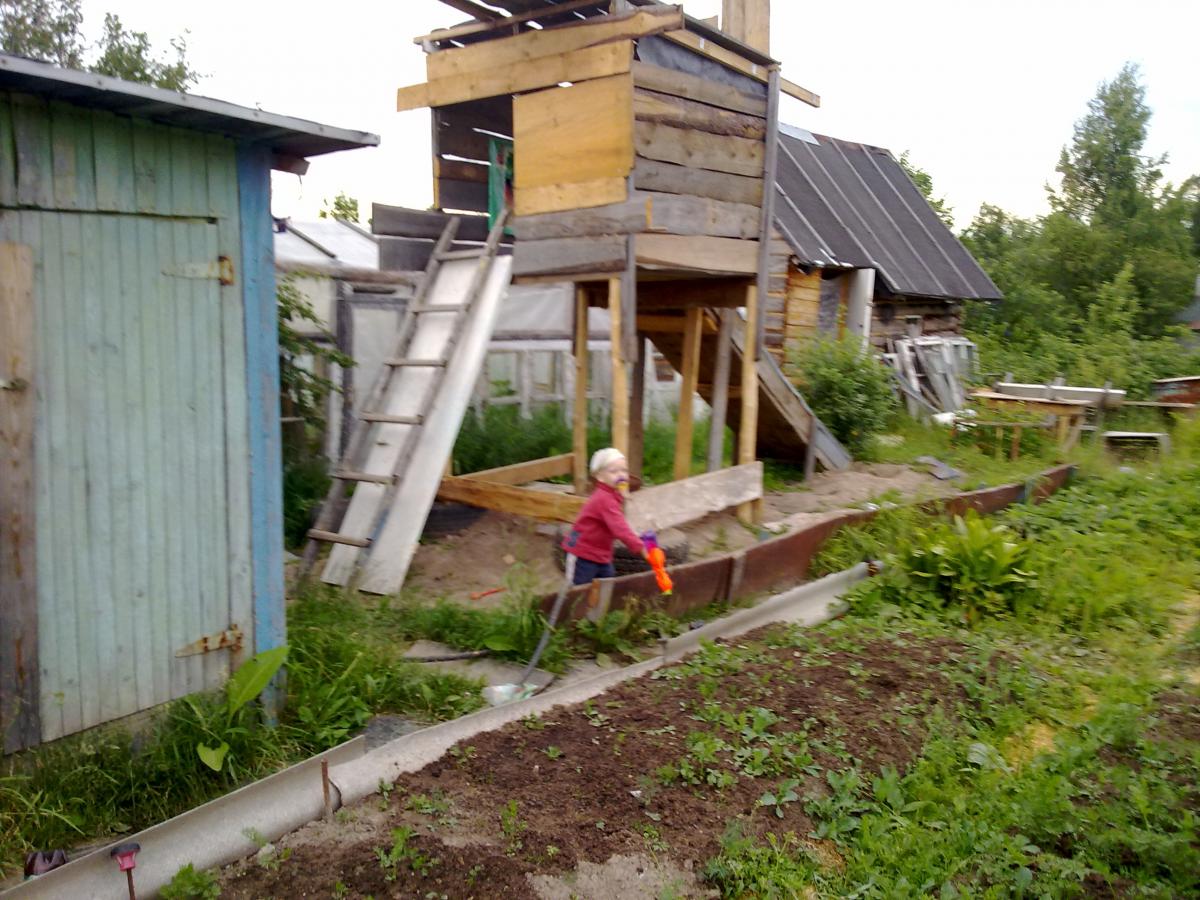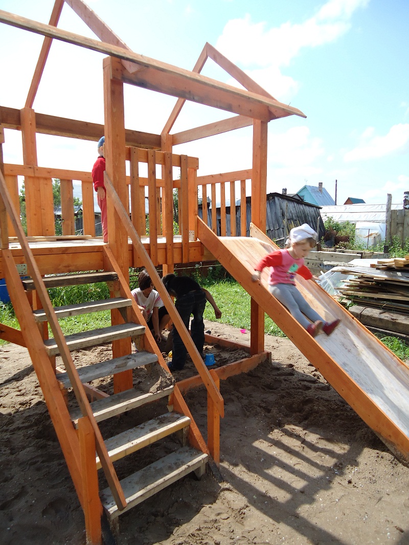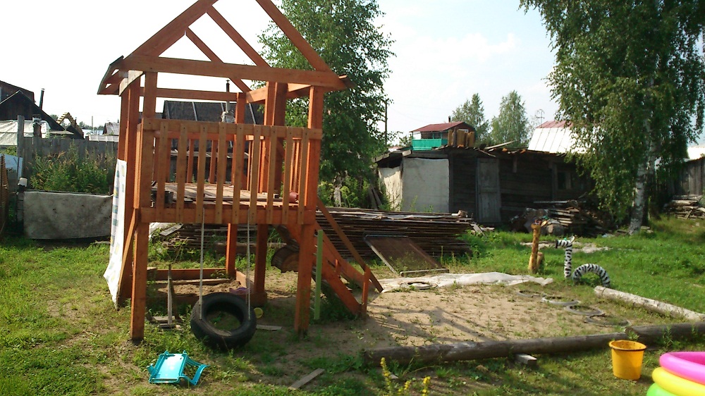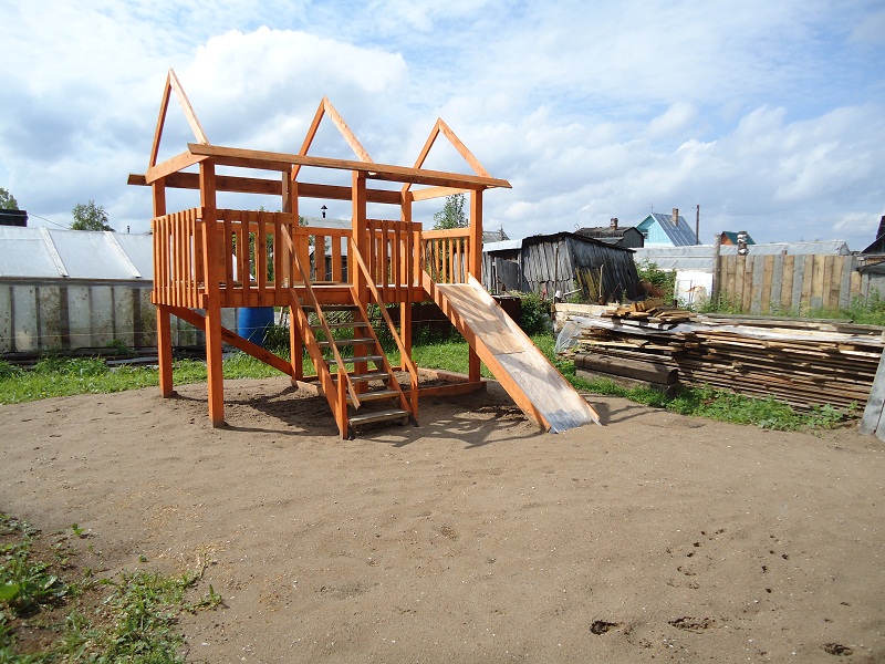 tata771011 Опубликовано 25 февраля, 2014 Опубликовано 25 февраля, 2014 Вот, похвастаюсь своей площадкой.Планируется сделать крышу,будет вроде домика на втором этаже.Внизу песочница.На горку стелим кусок линолиума,в штанах хорошо кататься.Под всю площадку стелили черный укрывной материал, сверху засыпали песок, но за два года всё засеялось подорожником и ещё какой-то травой.Лучше уж газоном засеять надо было.