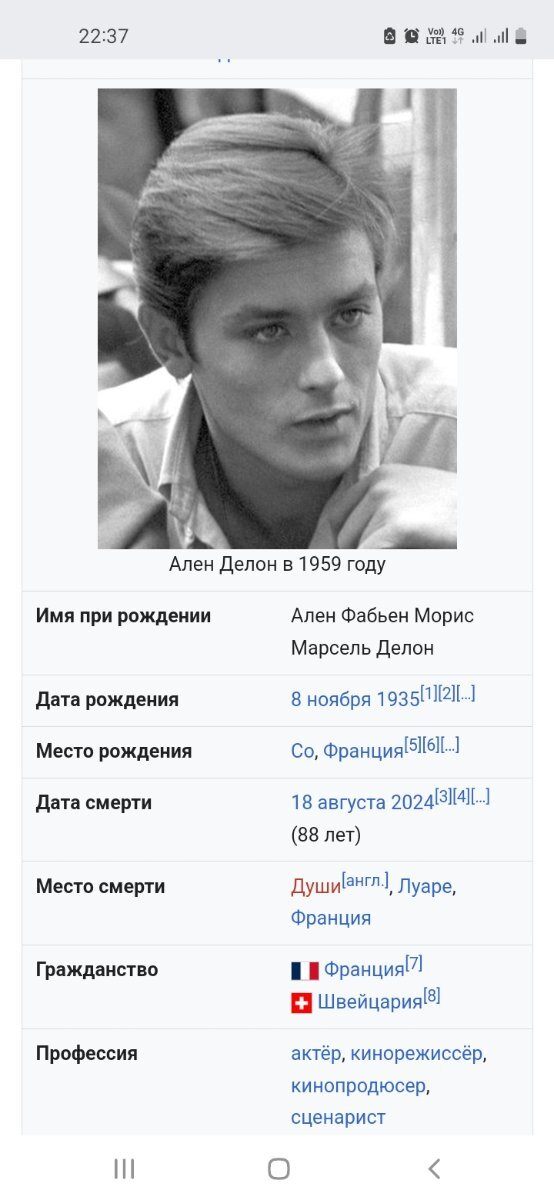 Караванщик Али Опубликовано 28 сентября, 2024 Опубликовано 28 сентября, 2024 Марчелло Винченцо Доменико Мастроянни (Marcello Vincenzo Domenico Mastroianni). Родился 28 сентября 1924 года в дер. Фонтана-Лири в Апеннинах - умер 19 декабря 1996 года в Риме. Итальянский актёр. Лауреат премий «Золотой глобус» (1963), BAFTA (1964, 1965), «Давид ди Донателло» (1964, 1965, 1986, 1988, 1995), «Серебряная раковина» (1965), Приза Каннского кинофестиваля» (1970, 1987), Премии Европейской киноакадемии (1988), Кубка Вольпи (1989, 1993), «Золотой лев за карьеру» (1990), «Сезар» (1993). https://stuki-druki.com/authors/Mastroianni.php Брижит Анн-Мари Бардо (фр. Brigitte Anne-Marie Bardot). Родилась 28 сентября 1934 года в Париже. Французская актриса, певица и общественный деятель. https://stuki-druki.com/authors/Bardot.php