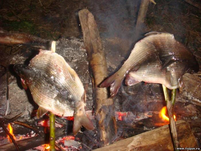 Запекаю на рожне так: Хариуса почистить от чешуи, выпотрошить, распластать, посолить, прошить заострённым прутиком пару раз. Прутик с рыбой под наклоном установить к костру распластанной стороной, поворачивать не надо. Готово минут через 15-20. Получается этакий печёно-подкопчёный харюзок.