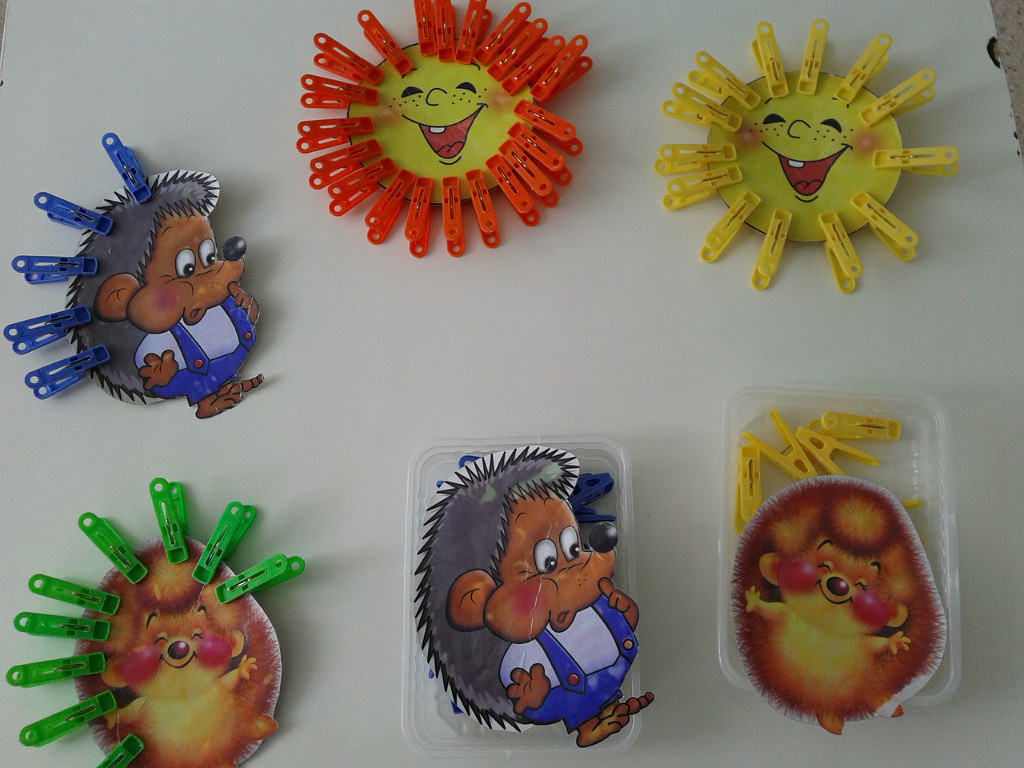 КсюЛя Опубликовано 24 сентября, 2014 Опубликовано 24 сентября, 2014 Какие родители молодцы!!!!! А что за такие интересные коробочки в которых хранятся картинки и прищепки? Это просто контейнеры. Цель игры одеть прищепки на солнышко (сделать ему лучики) или на ежика (прицепить иголки) Вот что нашла в инете по поводу игр с прищепками: В играх с прищепками малыш задействует большой и указательный пальцы, которые в дальнейшем берут на себя основную нагрузку при письме. При нажатии на прищепку совершается мышечное действие, схожее с движением по удержанию ручки, и прилагается аналогичное усилие. Подспудно в играх с прищепками для детей развиваются речь и творческое воображение, формируются сенсорные и пространственные понятия. А на красном фоне это резинки для денег, которые можно растягивать в разные стороны и получать различные фигуры.