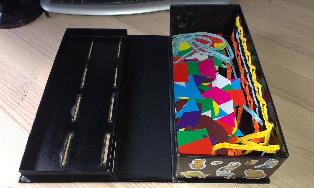 netlll Опубликовано 12 октября, 2014 Опубликовано 12 октября, 2014 Девочки, еще одно творение))) Фигурки из цветной бумаги заламинированные - кидаются в соответствующие дырочки!!! Сбоку просто шнуровка)))