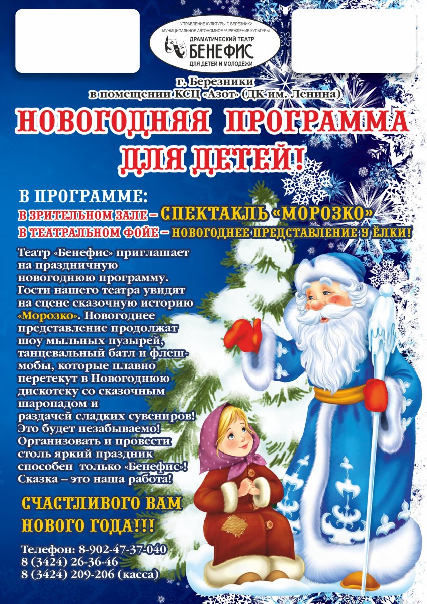 adminbenefis Опубликовано 6 декабря, 2019 Автор Опубликовано 6 декабря, 2019 (изменено) "Драматический театр "Бенефис" для детей и молодёжи" в помещении КСЦ "Азот" (ДК им. Ленина) Репертуар - Декабрь - Январь 2019 Премьера! 7 - суббота - начало 12.00 "Аленький цветочек" (0+) Сказка 8 - воскресенье - начало 12.00 "Летучий корабль" (0+) Мюзикл 8 - воскресенье - начало 15.00 "Братец Лис и Братец Кролик" (0+) Ковбойская сказка 15 - воскресенье - начало 12.00 "Похищение луковиц" (0+) Сказка-детектив 15 - воскресенье - начало 15.00 "Винни Пух и все, все, все..." (0+) Музыкальная сказка 21 - суббота - начало 12.00 "Приключения Фунтика" (0+) Сказка 21 - суббота - начало 15.00 "Проделки Бабы-Яги" (0+) Музыкальная сказка 31 - вторник - начало 14.30 Сказочная история "Морозко" и Новогоднее представление у Ёлки (0+) 1 января - начало 14.30 Сказочная история "Морозко" и Новогоднее представление у Ёлки 8 января - начало 12.00 Сказочная история "Морозко" и Новогоднее представление у Ёлки Телефон: 8 (3424) 209-206 (касса) 8 (3424) 26-36-46 E-mail: teatr-benefis@yandex.ru Сайт театра: teatrbenefis.ru Изменено 6 декабря, 2019 пользователем adminbenefis