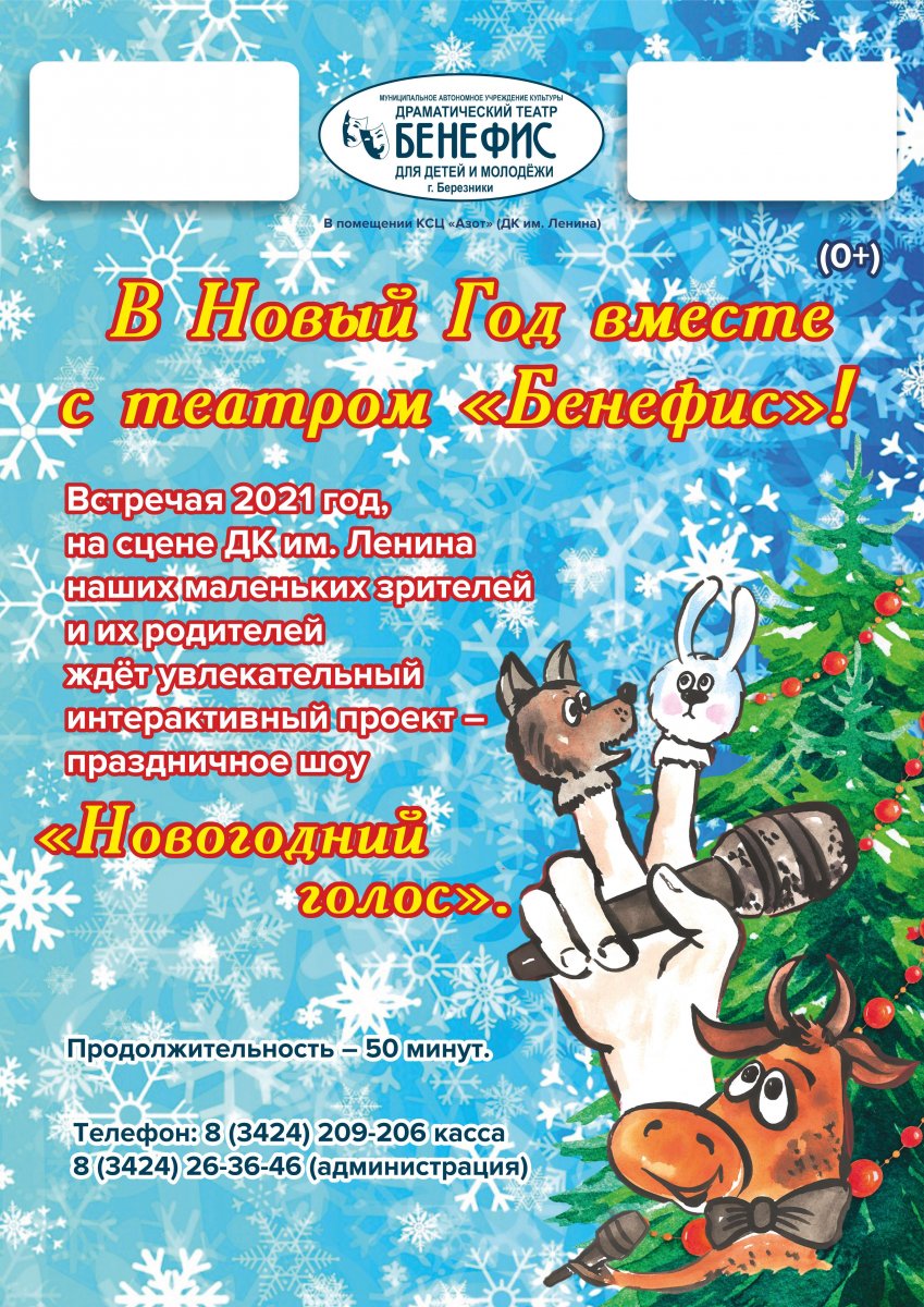 adminbenefis Опубликовано 3 декабря, 2020 Автор Опубликовано 3 декабря, 2020 (изменено) "Драматический театр "Бенефис" для детей и молодёжи" в помещении КСЦ "Азот" (ДК им. Ленина) 29 декабря - начало 14.00 31 декабря - начало в 12.00 1 января - начало в 14.00 2 января - начало 12.00 Праздничное шоу "Новогодний голос" (0+) Цена билета: детский 150 руб. взрослый 150 руб. Телефон: 8 (3424) 209-206 касса Изменено 24 декабря, 2020 пользователем adminbenefis