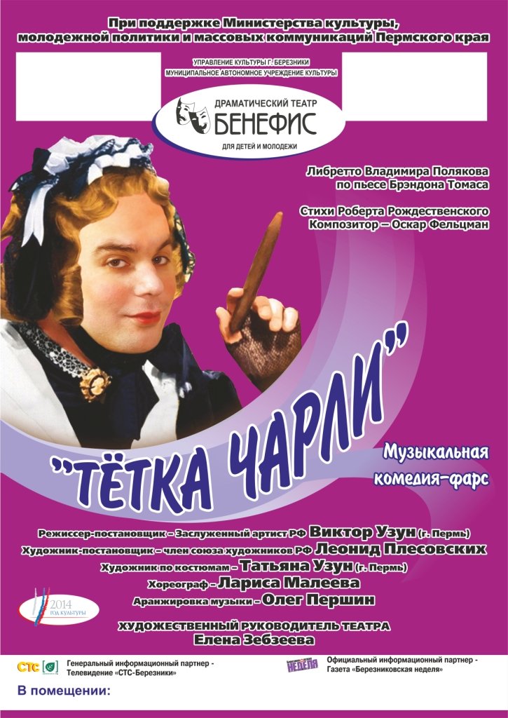 adminbenefis Опубликовано 22 января, 2021 Автор Опубликовано 22 января, 2021 (изменено) Муниципальное автономное учреждение культуры «Драматический театр «Бенефис» для детей и молодёжи г. Березники (в помещении КСЦ «Азот» (ДК им. Ленина) «Тётка Чарли» (12+) Музыкальная комедия-фарс В роли Тётки Чарли - Павел Ефремов!!! Сюжет музыкальной комедии «Тетка Чарлея» российскому зрителю хорошо знаком по любимому фильму «Здравствуйте, я ваша тетя!» про ту самую «тетушку из Бразилии, где много-много диких обезьян!» Оксфордским студентам Чарли Вайкэму и Джэку Чеснэю просто необходимо срочно найти компаньонку для их любовных свиданий с Энни и Китти. С этой целью они вынуждают своего товарища Фрэнкерта Баберлея переодеться в женское платье и сыграть роль тети Чарли из Бразилии Донны Люции. Осложнения начинаются, когда богатая «тетя» начинает подвергаться любовным атакам дяди Энни и опекуна Китти старого Стэфана Спетлайга, и отца Джэка сэра Фрэнсиса Чеснэя. А когда приезжает настоящая Донна Люциа, ситуация становится просто неуправляемой… Дорогие друзья! Приглашаем Вас на спектакль «Тётка Чарли» В КСЦ «Азот» (ДК им. Ленина) 6 марта 2021 г. начало в 18.00 Обращаться по телефону: 8 (3424) 26-36-46 8 902 47 37 040 Продолжительность спектакля – 2 часа 30 мин. с антрактом. Цена билета: 300 руб. Дети до 12 лет на вечерние спектакли не допускаются. Изменено 3 февраля, 2021 пользователем adminbenefis