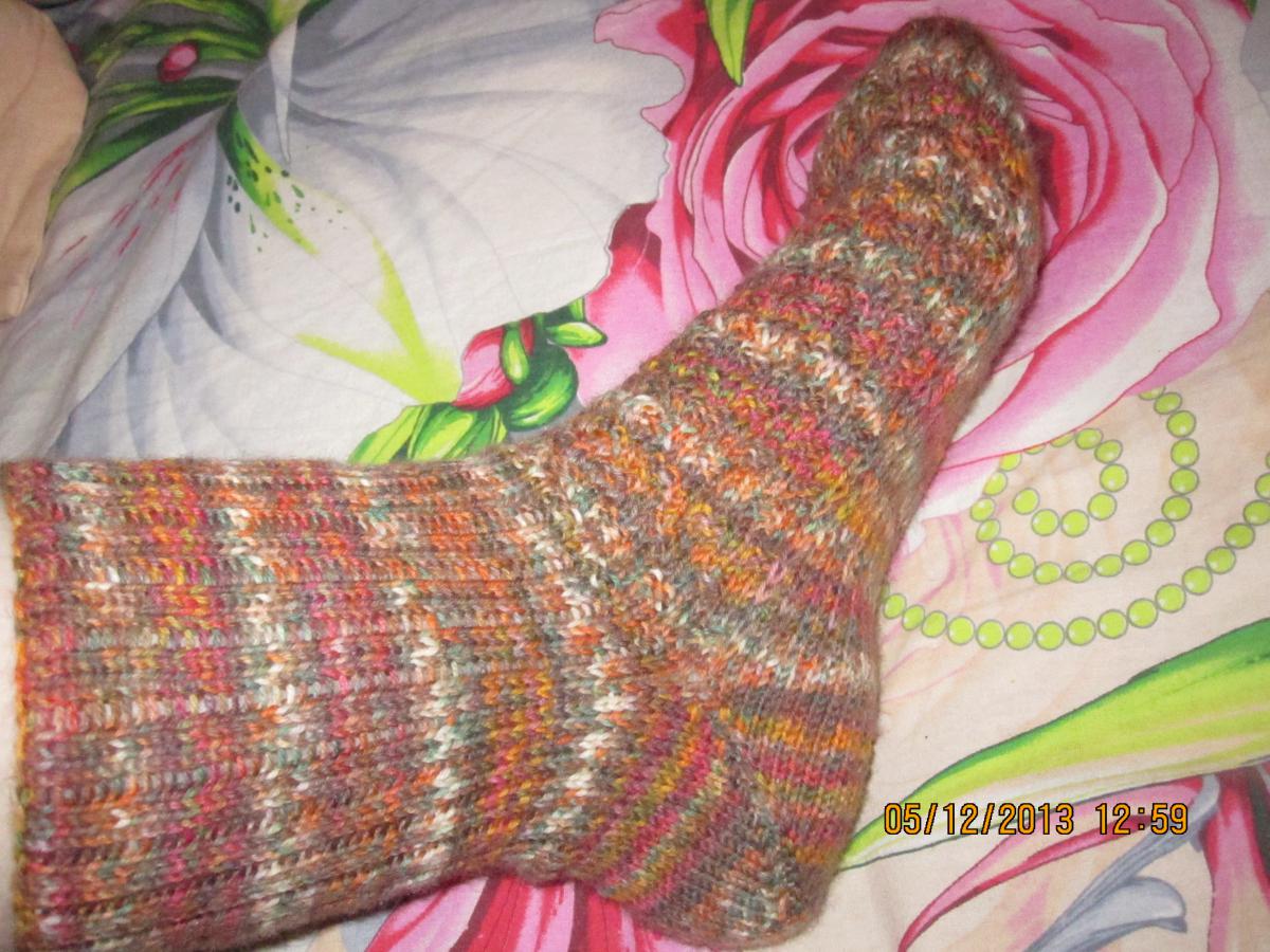 galcha Опубликовано 5 декабря, 2013 Опубликовано 5 декабря, 2013 Мои первые носочки из Opala. Фотографировала на своей ноге 42 размер, поэтому свободновато смотрятся. Первый раз попробовала пятку с укороченными рядами. Удобное описание приложила. Ещё нашла идейку укреплять подошву и пятку снятыми петлями. Первый ряд: 1 лиц, 1 снять как лицевую, 2 ряд: все лицевые. За счёт перетяжек вязание более плотное и укрепленное и красивый рубчик получается.
