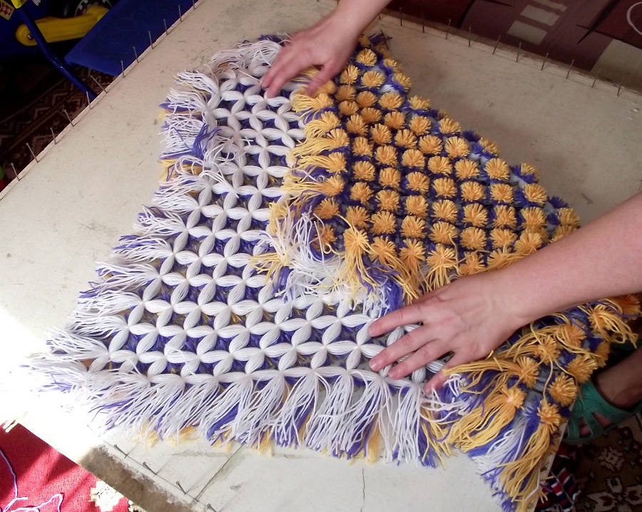 liesenok Опубликовано 11 июля, 2014 Опубликовано 11 июля, 2014 Процесс изготовления нашла в интернете, не сложно, но достаточно трудоемко. Нужен щит (80*80), каждые 4 см по краю приколотили гвозди. Затем наматывается 50 слоев нити, перевязываются перекрестки, и из половины ниточек делаются помпоны. Чтобы легче было делать помпоны, и не считать определенное колличество нитей для них, сделала основу из белой нити (20 слоев). Примерно 2,5 мотка - 520 м. Затем для помпонов наматывала нити другого цвета (30 слоев), 20 слоев синего и 10 желтого цвета. Цветные ниточки разрезала, а основа из белых остается не тронута. Первое одеяло наматывала по одной нити, второе уже делала в две нити, процесс пошел быстрее. Перекрестки вязала в 2 нитки, для крепости (использовала ИРИС). Первое одеяло делала наверно три вечера и одну ночь. Второе было по-быстрее - 2 вечера и чуть чуть утро. Нитки использовала вот эти http://www.kudel.ru/...productID=23301 На одеялко ушло 6-7 мотков по 230 м.