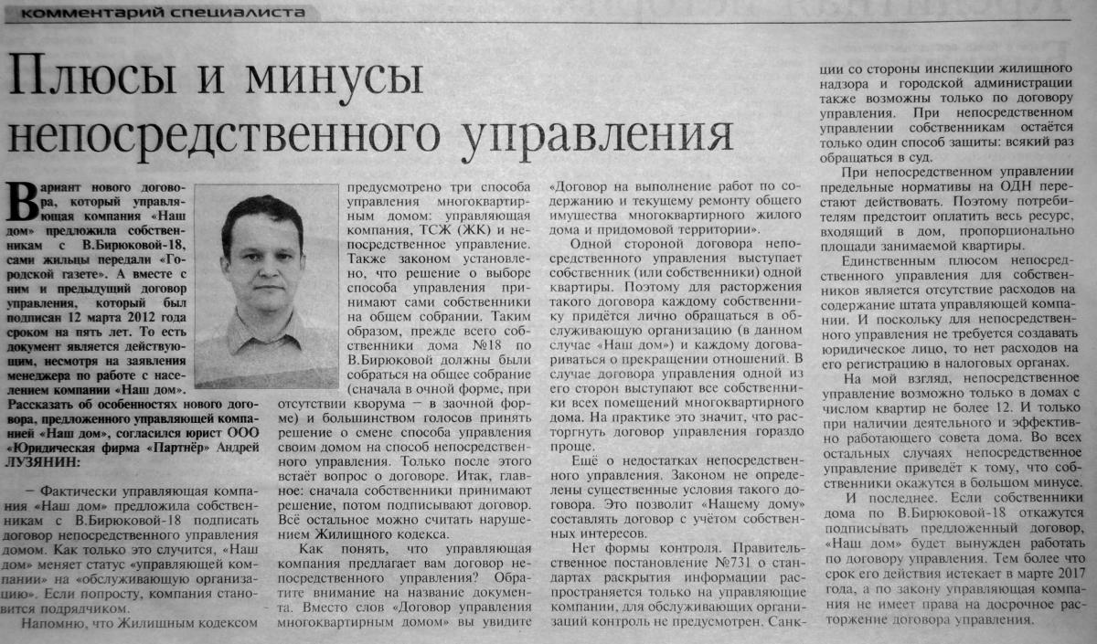 rum Опубликовано 6 декабря, 2013 Опубликовано 6 декабря, 2013 Исходя из положения ст. 164 ЖК РФ http://www.zakonrf.info/jk/164/ в случае выбора Непосредственного Управления (предлагаю в дальнейшем сокращать НУ), каждый собственник должен будет заключить договары с ресурсоснабжающими организациями. Как это будет воплощаться - я вообще представить не могу. И что, любую мелкую проблему при нарушении договора со стороны организации нужно будет решать через суд??? На мой взгляд проблема надумана и паника преждевременна. Подавляющее большинство подпишет эти договора и с этим ничего не поделаешь. Будет так как захочет УК. Факт. В Соликамске эта схема работает с момента перехода муниципальных ЖПЭТов в ООО. Если память не изменяет с 2007 года. Все живы и здоровы. Правда при этом за ОДН платят сами жильцы. И какие показания снимают ресурсники - одним им и ведомо. Обзываясь обсуживающими, управлялки в первую очередь хотят обезопасить себя от ресурсников. А деньги жильцов они тратили бесконтрольно и до этого. По ЖК никаких обслуживающих организаций нет. Данная ситуация возможна только при полном попустительстве власти, а как по другому, если законы не исполняются. Не удивлюсь, если из уставов всех этих новых комофортов убраны слова с корнем "прав". Вот хотелось бы услышать развернутые комментарии от представителей ГА... А в ЖК используется “управляющая организация“. Чем они управляют в случае НУ, хрен знает... Любители детективов могут почитать,как это всё происходило уже в одном из городов. Комментарии читать тоже. http://www.volzsky.ru/index.php?wx=16&wx2=16770