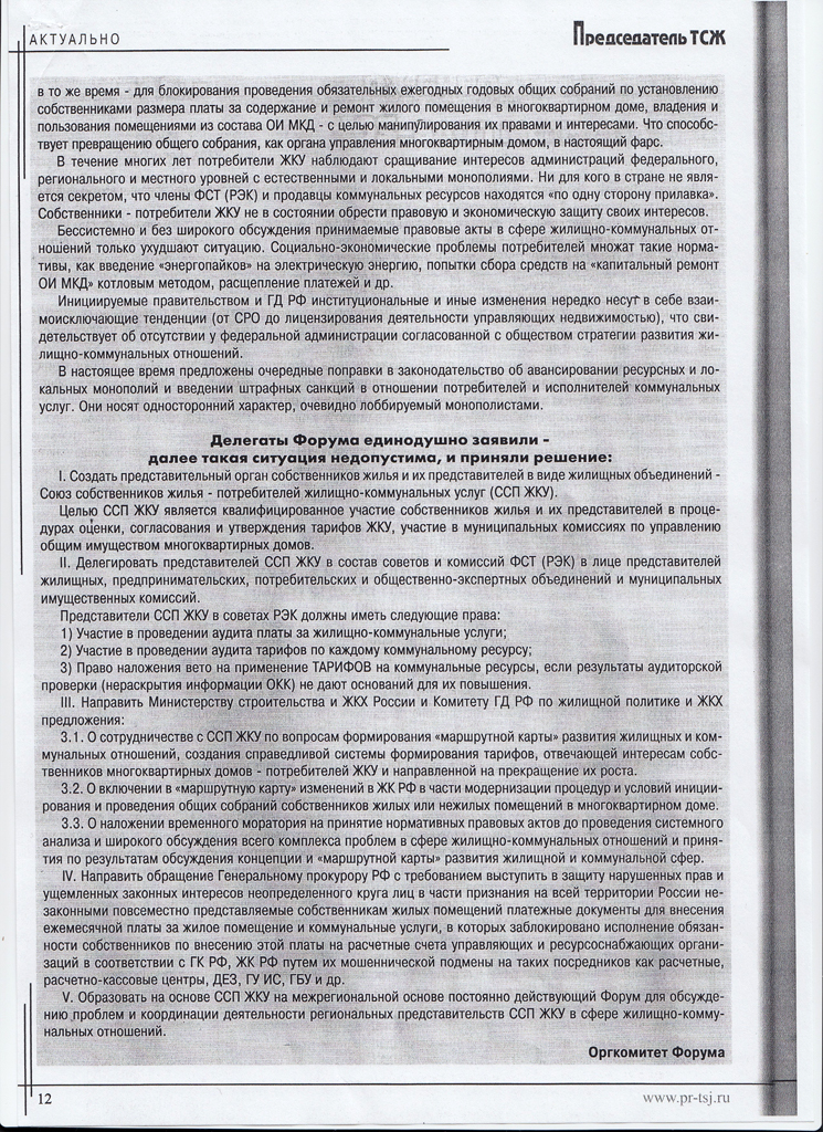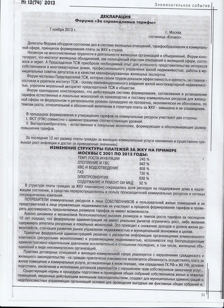Алёна Козырева Опубликовано 6 февраля, 2014 Опубликовано 6 февраля, 2014 К вопросу аудита коммунальных тарифов. В конце прошлого года в Москве прошёл всероссийский форум председателей ТСЖ "За справедливые тарифы". Принята декларация. По-моему, дельные предложения.