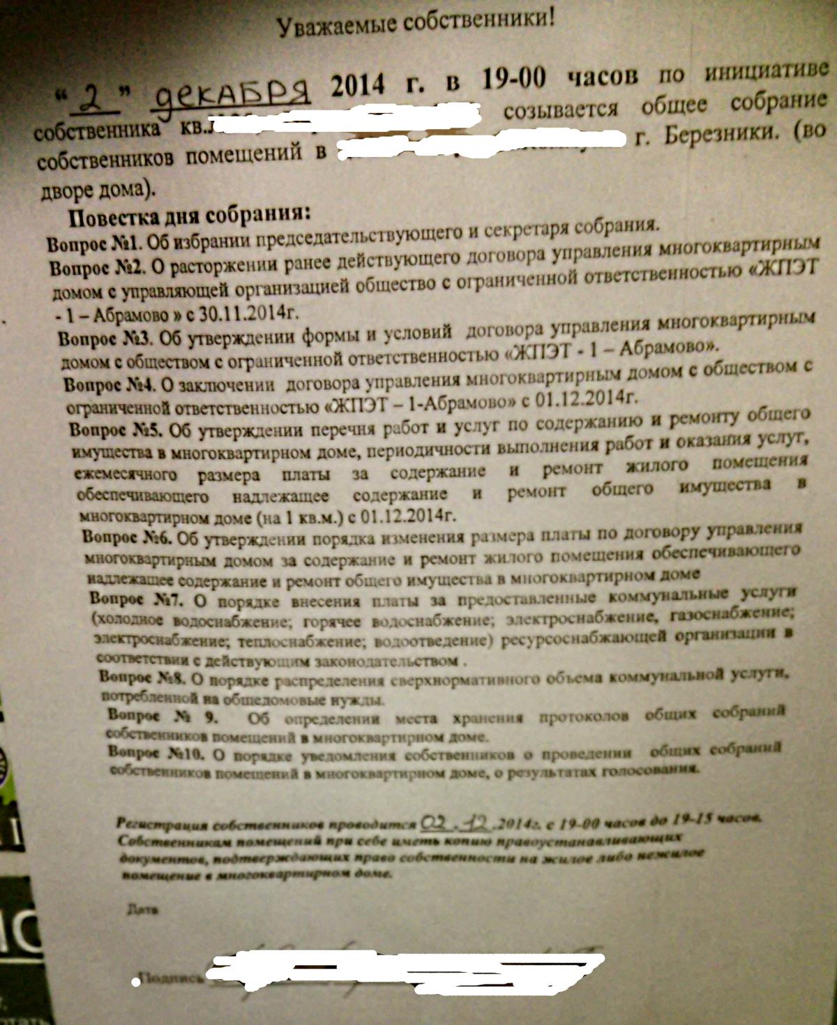 GARRY6490 Опубликовано 26 ноября, 2014 Опубликовано 26 ноября, 2014 Ну вот похоже и до нас дотянулась костлявая рука УК - Пятилетки 126. Ориентировочно вчера (25.11) на подъездах появилось объявление о проведении общего собрания, инициированного одним из жильцов-собственников (выяснить кто такой пока не удалось по причине недавнего жильца появления - вроде как покупан). Собрание назначено на 27.11. И сразу вопросы, ибо надо хотя бы минимально подготовиться. Со сроками предупреждения жильцов о собрании всё нормально? Кто что-то важное писал по поводу того, на что особо обратить внимание на таком собрании - ткните в ваши посты. Само объявление постараюсь сегодня либо снять, либо переснять, чтобы знать, какие вопросы вынесены. Где-то в районе 8-10 со слов видевших. Эх, не было печали... Сейчас начнется лапша на уши. ЗЫ Насколько я помню, с момента начала темы кое-что кардинально изменилось - напомните хотя бы в общих чертах, какие есть подводные камни и где собака порылась сейчас? Есть кто ещё здесь из жителей дома?