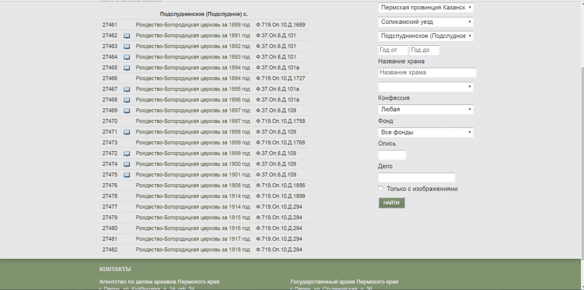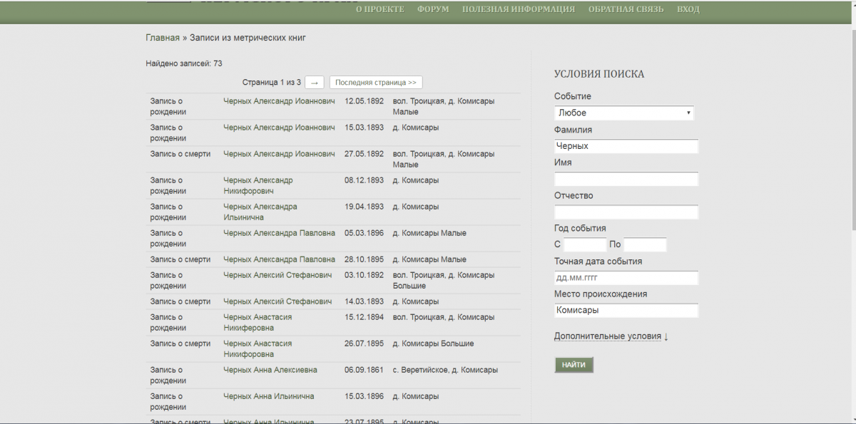 Каштанка Опубликовано 13 октября, 2018 Опубликовано 13 октября, 2018 (изменено) Заглянув на Поколение Пермского края по событию - бракосочетание и ФИО Даниил Иаковлев Черных нашла следующие данные 25 октября 1892г Жених - деревни Малых Комиссар крестьянин Даниил Иаковлев Черных вторым браком 48 лет Невеста - крестьянская девица деревни Вижая Параскева Иоакимова Шумкова первым браком 23 года Поручители по жениху: крестьяне деревни Комисары Иоанн Михайлов Черных, Павел Алексиев Черных Далее написаны поручители по невесте, они вам тоже будут нужны, если начнёте копать дальше. Но уже из этой записи можно узнать по сканам, перелистывая обе метрические книги, рождённых в этом браке детей, особенно смотрите кто был их крестниками, чаще всего это самые родные люди данной семьи, кроме того можно узнать, перелистнув назад, кто была его первая жена, её надо искать по умершим, кроме того, вам могут обращайте внимание на всех из Малых Комиссар, скорее всего и там что-нибудь накопаете. И так далее. проштудировав все метрики по этой церкви вы через какое-то время сомжете составить более-менее своё древо. То, что не отсканировано можно будет найти в Перми в госархиве, листая сами метрики. Сначала ищите чисто по событию (бракосочетание, развод, рождение, смерть) и ФИО человека. Так у вас быстро образуется круг поисков. Например, берём фамилию Черных и место Комисары и сайт нам находит 3 страницы людей, всех штудируем, составляем схему кто у кого родился на ком женился, заодно смотрим крёстных и поручителей. Меняя букву в фамилии, букву в названии, другие условия поиска вы ещё больше можете узнать, так как люди же забивают данные, могут и ошибиться, тогда система тоже будет ошибаться. Например, выбрав справа в Условиях "рождение" вы можете выбрать всех ваших рождённых по отцу и матери. Выбрав в Условиях "смерть" вы увидите умерших, сразу скажу, что большинство это будут недавно рождённые дети, но и пожилые родители ваших персоналий тоже могут быть. Чтобы зайти на Персоналии, нажмите сначала на Главную, выскочит вот такая страница Выбирайте что вам надо. Персоналии выберете - будете искать по фамилии. Выберете Географический указатель - Малые Комисары там не найдёте, ищите по церкви - это село Подслуднинское, так как эта деревня относилась к церкви в Подслудском. Видите сколько метрических книг отсканировано? Их можно сидя дома все проштудировать. Неотсканированные в госархиве просмотрите и выпишете своих. Последний скриншот не могу удалить пока, нечаянно повторила. У ваших год самый ранний 1889. Это очень недавно. Значит, если будете копать глубже, вам надо будет выяснить до этого года к какой церкви относились Комисары. Нашла на более позднее время административную, видимо, принадлежность. Список населенных мест Соликамского уезда Пермской губернии по состоянию на 1904 год А вот какое большое село с церковью было ближе всего территориально? Изменено 13 октября, 2018 пользователем Каштанка