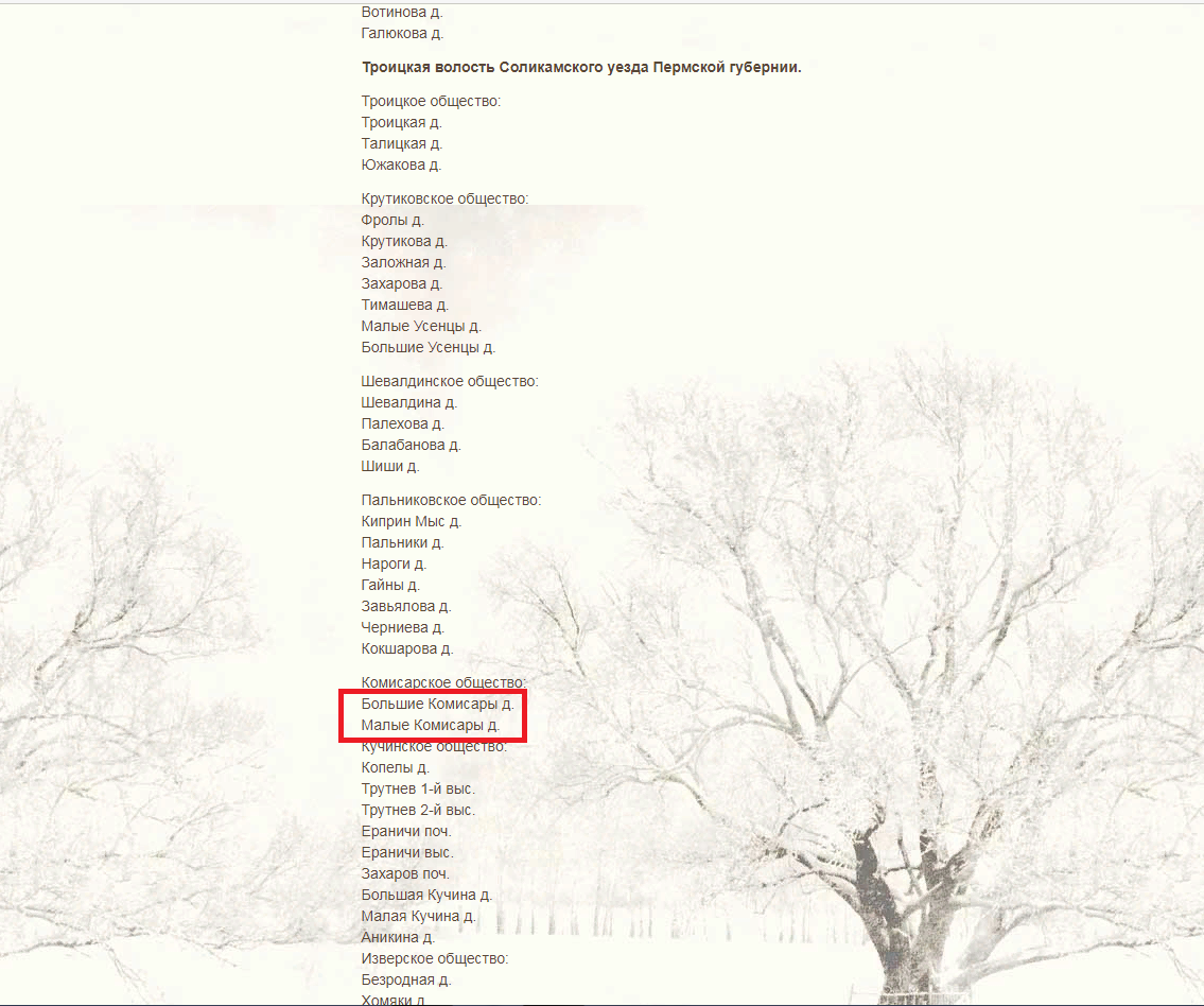 Dreadlocks Опубликовано 10 октября, 2018 Опубликовано 10 октября, 2018 (изменено) Фамилия одновременно простая и тут же - сложная. Всё усложняет вариант Чермных, которых тоже много в наших краях. А ещё есть Черемных. Имеются сведения о Чермных Даниле Яковлевиче 1844/1845 года рождения. крестьянин поч. Над рекой Черемшанкой (или д. Талица) отец Чермных Яков Федорович (рожд. 1817/1818) мать Чермных Ирина Федоровна (рожд. 1823) В 1867 году родилась девочка, но быстро умерла Но они не очень вписываются в нужное время. Да и названия менялись у деревень. Красных и Чермных вписаны в д. Комиссарова над р. Бол. Талица ... и деревня Комисарты, Что стояла в том краю, Так ее, кажись, назвали Наши предки в старину, Черемшанка быстрая До сих пор течет, К ней зимой и летом Поить гоняли скот... Это дед такие стихи в дневнике писал :) Здесь ценно Комисарты и Черемшанка которые видимо находились где-то рядом. На современных картах Черемшанка в окрестностях Березников не попадается (ну или я не нашел). Но в "Соликамский1816 ГАПК. Ф.111. Оп.3. Д.41. (498 л.) Ревизская сказка по Соликамскому уезду" попадается следующее "Крестьян В Зырянской волости В деревнях: Васевой, Старой Заразиловой, Сухановой, Новой Сухановой, В починке Юхине, В деревне Пермяковой, Мосягиной, В Новой Заразиловой, Над речкою Пыскорской, В починке над Черемшанским родником, Над Клестовским родником, В починке за Толычем Безъштаниковых. Как раз наши окрестности. Никаких Комисаров или Комисартов нет. Но есть починок над Черемшанским родником. Починок т.е. какое-то новое поселение. Возможно позднее он стал Комисарами (сартами). В дневниках дед писал, что позднее они переселились в соседнюю деревню Чашкинцы. Чашкинцы известно где, а по карте ниже в сторону Яйвы на месте бывших деревень урочища Малые и Большие Комиссары. Черемшанки там нет но есть река Талица. А от Малых в сторону Больших Комиссаров по опушке леса течет какая-то безымянная речка. Возможно это и есть Черемшанка. Еще интересная картина получается с фамилиями :) Черемный — перм., вят., сиб.«чермный, красный, рудой, особ. рыжий (о волосах)» (Даль); черёмной, черёмный — «рыжий, красно-желтый (о цвете, окраске); с волосами, шерстью такого цвета»; «веснушчатый»; «красивый, заметной внешности». Т.е. черемный, чермный это в принципе красный (рыжий). Видимо что-то красное было (есть) в том районе раз обе фамилии вокруг это цвета "крутились". Может вода в речке красная :) А Чермных вполне могла трансформироваться в Черных (или наоборот). Но вот по датам нестыковка. Запилить сына в 85 лет это было бы сильно :) Изменено 10 октября, 2018 пользователем Dreadlocks