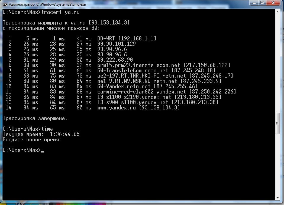 BenderRodriguez Опубликовано 29 октября, 2010 Опубликовано 29 октября, 2010 Трассировка маршрута к ya.ru [93.158.134.3] с максимальным числом прыжков 30: 1 <1 мс <1 мс <1 мс DD-WRT [192.168.1.1] 2 25 ms 25 ms 25 ms 93.90.101.129 3 25 ms 25 ms 25 ms 93.90.96.6 4 25 ms 25 ms 25 ms 93.90.96.6 5 155 ms 147 ms 156 ms 83.222.68.90 6 135 ms 141 ms 153 ms prm15.prm23.transtelecom.net [217.150.60.122] 7 303 ms 210 ms 201 ms GW-TransTeleCom.retn.net [87.245.248.18] 8 160 ms 170 ms 163 ms ae2-197.RT.TNR.HKI.FI.retn.net [87.245.248.17] 9 209 ms 210 ms 239 ms ae1-9.RT.M9.MSK.RU.retn.net [87.245.233.9] 10 232 ms 218 ms 213 ms GW-Yandex.retn.net [87.245.255.46] 11 178 ms 176 ms 181 ms carmine-red-vlan602.yandex.net [87.250.242.206] 12 200 ms 199 ms 239 ms l3-s1100-s2190.yandex.net [213.180.213.35] 13 189 ms 184 ms 194 ms l3-s900-s1100.yandex.net [213.180.213.38] 14 197 ms 181 ms 189 ms www.yandex.ru [93.158.134.3] Трассировка завершена. шо за хрень?!