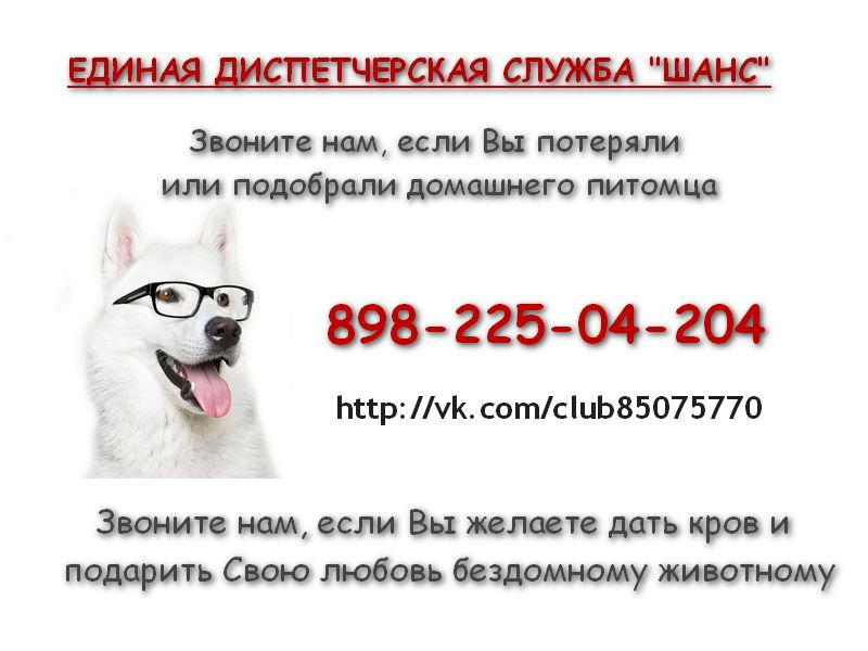 Rain Опубликовано 21 января, 2015 Опубликовано 21 января, 2015 (изменено) В городе создается единая диспетчерская служба «ШАНС» - это не специализированная служба, а волонтерская группа, т.е. сообщество людей, которым не безразличны судьбы животных, попавших в трудные жизненные обстоятельства. Основная задача создания ЕДС – это сосредоточение всей информации о найденных и потерянных животных в одном месте.Помимо интернет ресурса, будет работать диспетчер, который сможет более мобильно принимать и делиться имеющейся у нас информацией по телефону. Пока мы только начинаем, поэтому наша схема действий будет проста. К нам поступает сигнал о брошенном, потерянном или найденном животном и мы сразу будем размещать информацию в соц. сетях. Забирать животных к себе мы не сможем!!! Поиск временных передержек только ведется!!! Так же, Вы самостоятельно сможете размещать посты по теме группы http://vk.com/club85075770 Желательно, чтобы Ваш пост содержал следующую информацию: 1. Ваше имя, по возможности со ссылкой на вашу страницу. 2. Ваш телефон (по возможности) 3. Фотографию животного (по возможности). 4. Краткую информацию о животном: пол, примерный возраст, окрас, травмы (если есть), видимые болячки, внешнее состояние. 5. Место (нельзя указывать точный адрес) нахождения животного. 6. В чем заключается ваше участие в помощи животному. 7. Что ищите для животного. 8. Не используйте при написании текста CAPS LOCK. Вступайте в число участников нашей группы и приглашайте своих друзей и знакомых. Чем быстрее разойдется информация по городу, тем, возможно, более качествен будет поиск потеряшек. Учитывая, криминогенную ситуацию с отравлениями, считаю данную тему актуальной, уж по крайней мере домашние животные не должны бегать по городу. На временных передержках содержатся и котята и щенки. Можете в диспетчерскую, подавать заявки, кого бы вы желали приютить. Очень надеюсь на понимание, поддержку и сотрудничество!!! Изменено 22 января, 2015 пользователем Sladkay 6
