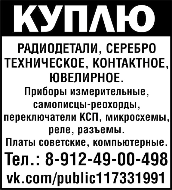 lion1985 Опубликовано 7 марта, 2014 Опубликовано 7 марта, 2014 ПОКУПАЮ ! Всупайте в группу https://vk.com/public117331991 СТРАНИЦА В ВКОНТАКТЕ И НФОРМАЦИЯ С ФОТО НА САЙТЕ[/size][/size] https://m.vk.com/id315452852 РАДИОДЕТАЛИ - резисторы, транзисторы, конденсаторы, реле, микросхемы, разъемы, переключатели, генераторные лампы ГИ-23Б ГИ-30 ГИ-34Б ГИ-66А ГИ-70Б ГК-12А ГМ-2Б ГМ-3Б ГМ-4Б ГМ-5Б ГМИ-2Б ГМИ-5 ГМИ-6 ГМИ-7 ГМИ-11 ГМИ-14Б ГМИ-16Р ГМИ-26Б ГМИ-32Б-1 ГМИ-38Б ГМИ-42Б ГМИ-46Б ГУ-43Б ГУ-66А ГУ-68А ГУ-72 ГУ-73 ГУ-74Б ГУ-88А ГУ-92Б ГУ-93Б ГИ-19Б ГИ-25 ГИ-5Б ЛЮБАЯ СРЕЗКА РАДИОДЕТАЛЕЙ С ПЛАТ ОТЕЧЕСТВЕННАЯ БЕЗ МЕТАЛЛОВ 20 РУБ КГ ПЛАТЫ ОТ БЫТОВОЙ И ПОМЫШЛЕННОЙ ЭЛЕКТРОНИКИ СОВЕТСКОЙ НЕРАЗОБРАНЫЕ. БЕЗ ЖЕЛЕЗА И ТРАНСФОРМАТОРОВ И БОЛЬШИХ КОНДЕРОВ ПЛАТЫ БЫТОВЫЕ СОВЕТСКИЕ 10-15 РУБ КГ ПЛАТЫ ПРОМЫШЛЕННЫЕ СОВЕТСКИЕ 20 РУБ КГ ПЛАТЫ ОТ МОБИЛЬНЫХ ИМПОРТНЫХ ТЕЛЕФОНОВ 400 РУБ КГ ОПЕРАТИВНАЯ ПАМЯТЬ 400 РУБ КГ МАТЕРИНСКИЕ ПЛАТЫ И ВИДИОКАРТЫ 70 РУБ КГ ПРОЦЕССОРЫ В КЕРАМИЧЕСКОМ КОРПУСЕ ОТ КОМПЬЮТЕРОВ фирм Intel и AMD , итд...60 РУБ ШТ ПРОЦЕССОРЫ ПЛАСТМАССОВЫЕ БОЛЬШИЕ БЕЗ МЕТАЛЛИЧЕСКОЙ ПЛАСТИНЫ ЦЕНА 10 РУБ ШТ ЛАМЕЛИ ЖЕЛТЫЕ ИМПОРТНЫЕ И СОВЕТСКИЕ ОТ ПЛАТ ОПЕРАТИВНОЙ ПАМЯТИ , ВИДИОКАРТ ИТД.. 3 ТЫС КГ Переключатели от КСП и Реохорды от резистивных элементов в составе самописцев серий: КСП-1, КСП-4, КСУ-1, КСД-1, КПУ-1, КПП-1, КПД-1, КП-41, и мостов уравновешенных самопишущих серий: КСМ-1, КПМ-1. 1. Микросхемы и транзисторы. Микросхемы и транзисторы в круглых, керамических, планарных, DIP, пластмассовых корпусах всех серий. Транзисторы в круглых, плоских, металлических, пластмассовых корпусах, силовые транзисторы. Импортные микросхемы и транзисторы в керамических, планарных, DIP и круглых корпусах. Индикаторы АЛС(3ЛС)321,324,333,338,светодиоды ... 2. Разъемы. Разъемы отечественного производства.Любые марки. Штырьки отечественных и импортных разъемов с желтым покрытием контактных частей. Ламели от плат импортные и отечественные желтые РАЗЪЕМЫ ПОЗОЛОЧЕННЫЕ - СНП-34-135,СНП-34-113,СНП-34-90,СНП-34-69,СНП-34-46,СНП-34-30,СНП-34-20. СНО-58-135,СНО-58-113,СНО-58-90,СНО-58-69,СНО-58-46,СНО-58-30,СНО-58-20. СНП-59(СНО-64)-96,СНП-59(СНО-64)-64,СНП-59(СНО-64)-32. ОНП-ВС,ОНП-НС,ОНП-8,ОНП-ЖИ,ГРПМ,ГРППМ,РПМ,РППМ,СНЦ,РС,2РМ,ШР и т.д. 3. Конденсаторы. Конденсаторы керамические монолитные в корпусном и бескорпусном исполнении. Основные марки:КМ3,КМ4,КМ5,КМ6,К10-7,-9,-17,-23,-26,-28,-43,-46,-47,-48. Конденсаторы керамические монолитные производства стран СЭВ. Конденсаторы танталовые. Основные марки:К52-1, К52-2,-5,-7,-9, ЭТО-1,-2 ,ЭТ, ЭТН, К53-1,7,18 и т.д. Емкостные сборки Б-18, Б-20, проходные фильтры Б-23, линии задержки МЛЗ, Микромодули, ГИС. Другие конденсаторы. 4. Переключатели, тумблера, кнопки. ПГ2, ПГ5, ПГ7, ПР1, ПР2, ПП6, ПП8, ПП9, ПП11, МП12, П1М9-1, П1М10-1, П1М11-1, П1М12-1, ПМ2-1, ПкП2-1, ПКН4-1, П2КнТА, ПК1С, ПК1Э, ПК2С, П1Т3-1,П1Т4-1, ПТ9-1, Пт11-1, Пт13-1, Пт23-1, Пт25-1, Пт27-1, Пт8. Другие переключатели. 5. Резисторы. СП5-1,2,3,4,14,15,16,17,18,20,21,22,24,37,39,44,СП3-39,СП3-19,37,44. ПП3-40,41,43,44,45,47. Потенциометры специального назначения. Основные марки: ППМЛ-М, ППМЛ-И, ППМЛ-ИМ, ППМЛ-Ф, ППМФ-М, ППБЛ-В, РПП, ПТП-1, ПТП-2, ПТП-5, ПЛП-1, ПЛП-2. 6. Реле РЭС7 РЭС8 РЭС9 РЭС10 РЭС14 РЭС15 РЭС22 РЭС32 РЭС34 РЭС37 РЭС48 РЭС78 РП 3,4,5,7 РПС 3,4,5,7 РПС 11,15,18 РПС20 РПС24 РПС32 РПС34 РПС36 ДП12 РКН РКНМ РКМ-1 РКМ-1Т РКМ-П РЭК43 ТРА ТРВ ТРЛ ТРМ ТРН ТРП ТРТ РТН ТРСМ-1,2 РВМУ-1 РКП Е-506 СК-594 РВ-5А РТС-5 Другие реле. 7.Разное Радиодетали специальной аппаратуры, гироскопы, электромеханические навигационные приборы. Датчики угла поворота, давления, термопары(ТПП,ТПР,ТСП), термосопротивления(ТСП), термодатчики, тензодатчики, датчики д
