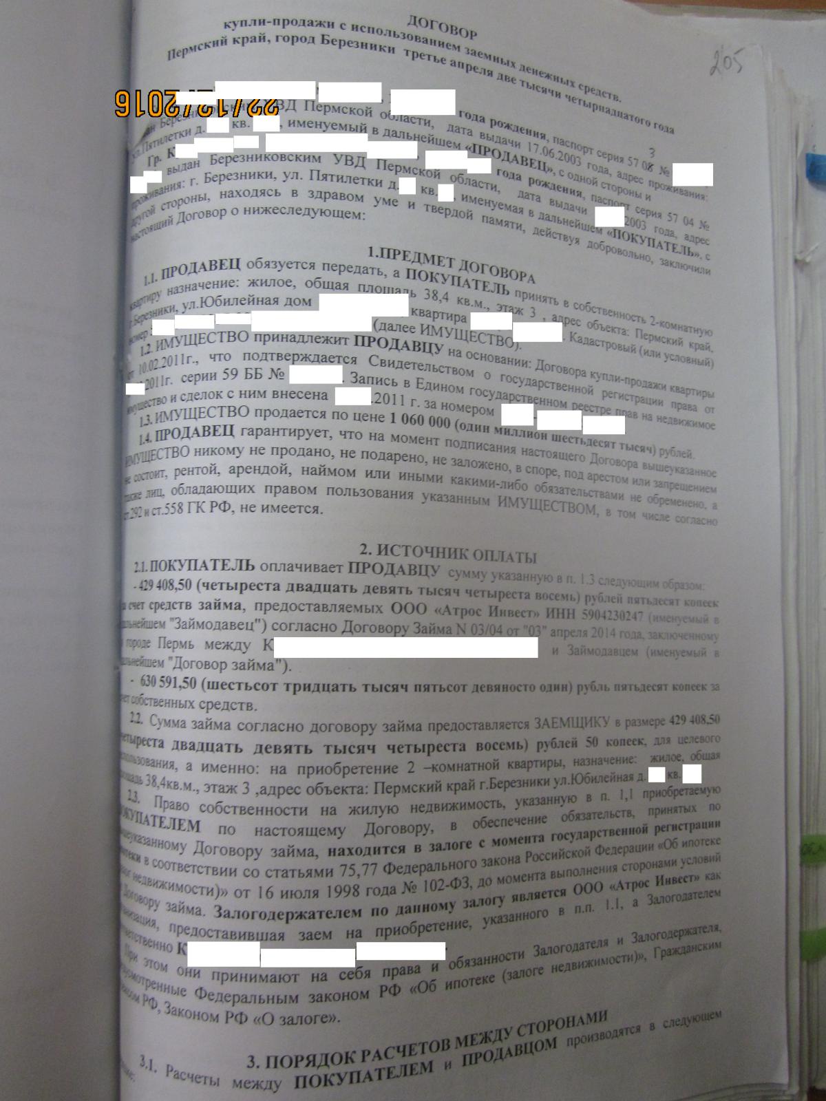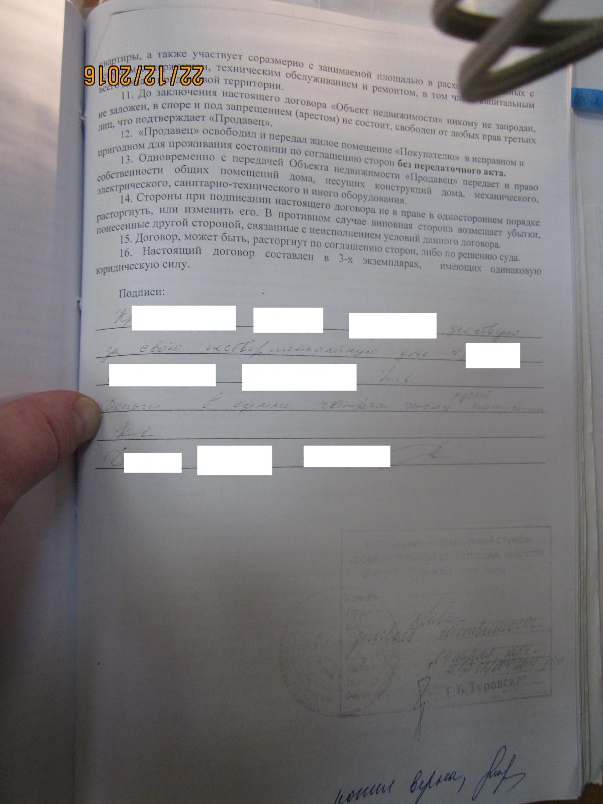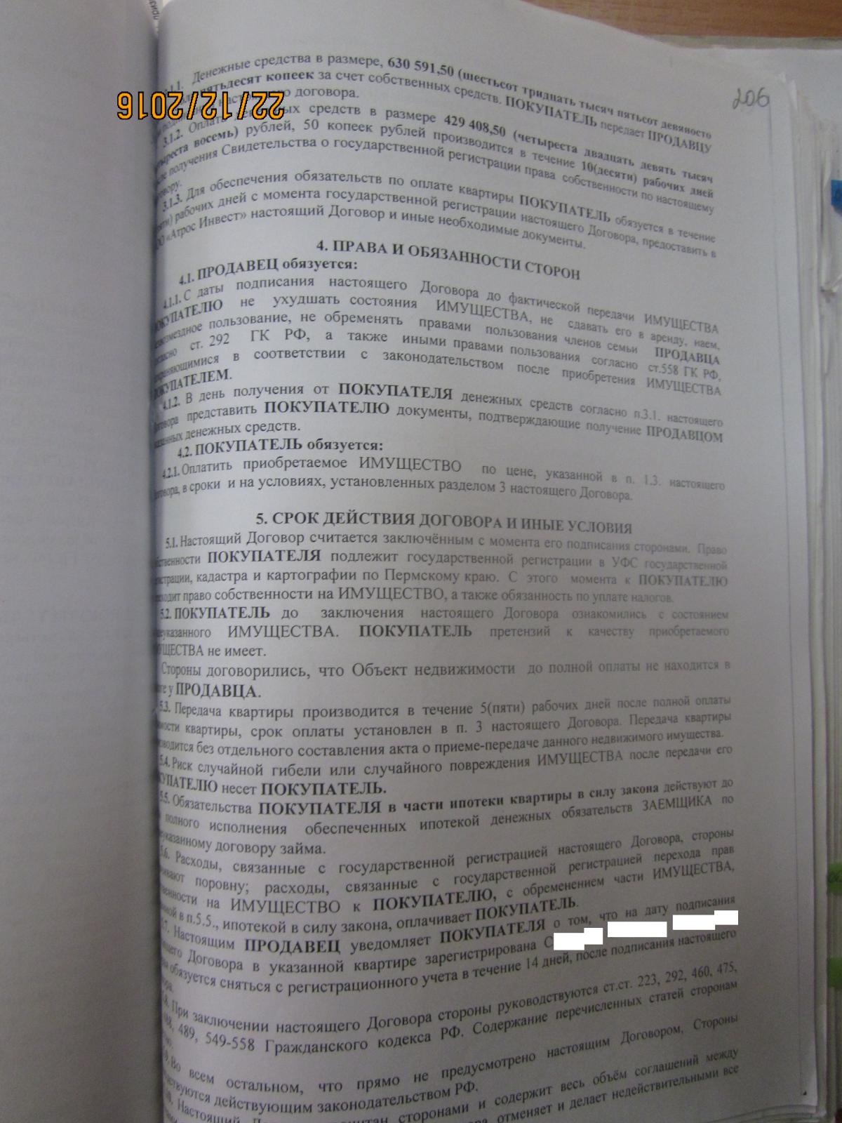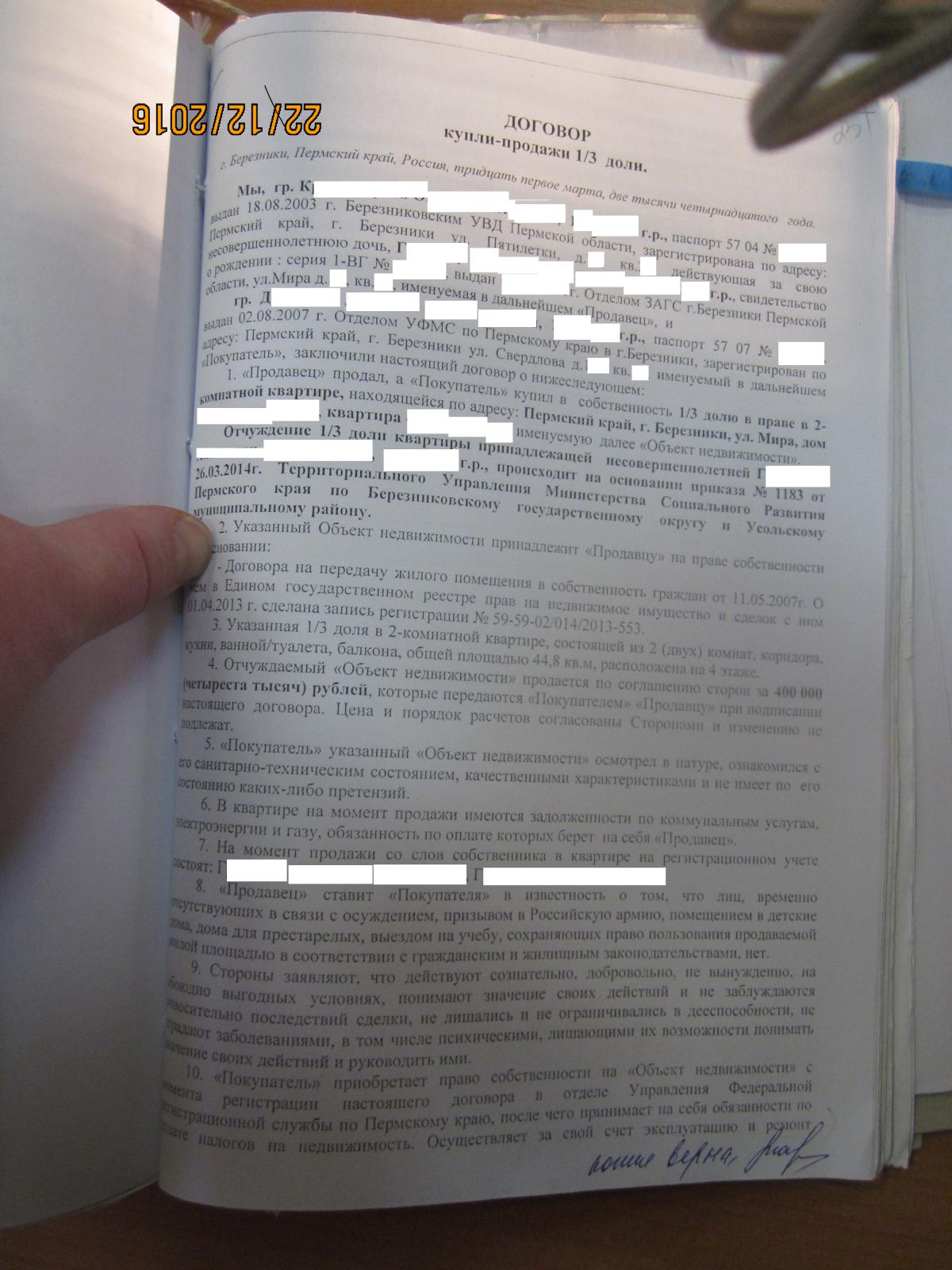 В согласии органов опеки написано, что они дают согласие на продажу доли в связи с одновременным приобретением жилья для девочки. Без одновременного приобретения жилья для девочки согласия на продажу доли опека не давала. Регистрационная палата должна была получить заявления о регистрации договоров продажи и покупки одновременно и одновременно регистрировать при соблюдении условия приобретения 1\2 доли в указанной квартире для девочки. Зарегистрировав договор продажи доли регистратор действовал без согласия органов опеки т.к. одновременного приобретения жилья для девочки не произошло. Результат - ребёнок без собственного жилья. По хорошему - должны были обратиться в полицию при получении договора о покупке квартиры без участия ребёнка для проверки на предмет мошенничества. Но и это не всё. При регистрации сделки по продаже доли не было представлено необходимых документов, но об этом чуть позже. Прикрепляю вторую страницу договора (что-то плохо грузится)