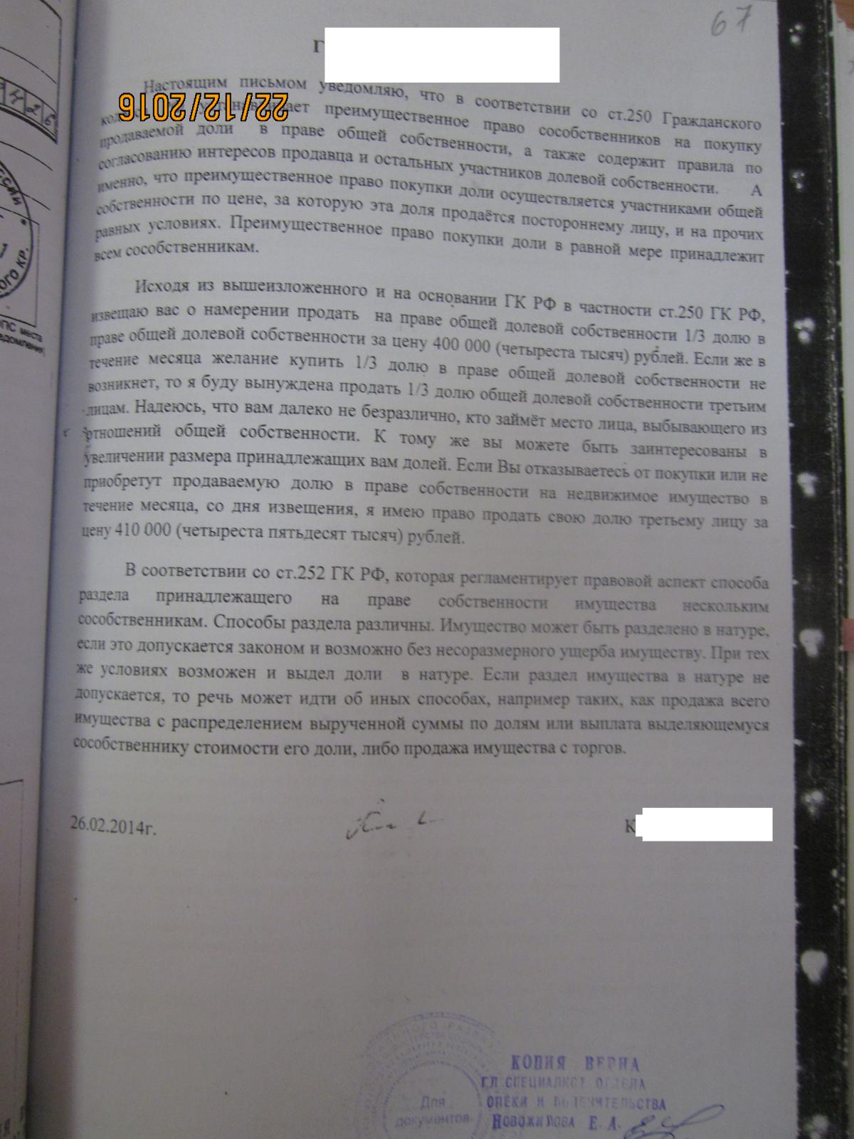 По просьбам трудящихся правом торгующих органов прикрепляю уведомление якобы направленное законному представителю несовершеннолетнего сособственника.