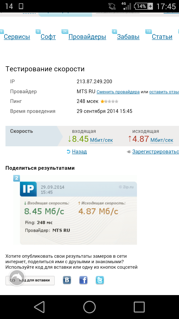 jimm031 Опубликовано 15 сентября, 2014 Опубликовано 15 сентября, 2014 Ну мой аппарат пока не видал 4G. Ну вот из лучшего, что видел у себя через MTS-3G, стрелял по серверу МТС в Катере(наверное типа внутрянка) С Ютуба иногда ролики в несколько потоков качаются со скоростью около 2Мбайт/с. З.Ы. Симка 4G? несаморезанная?