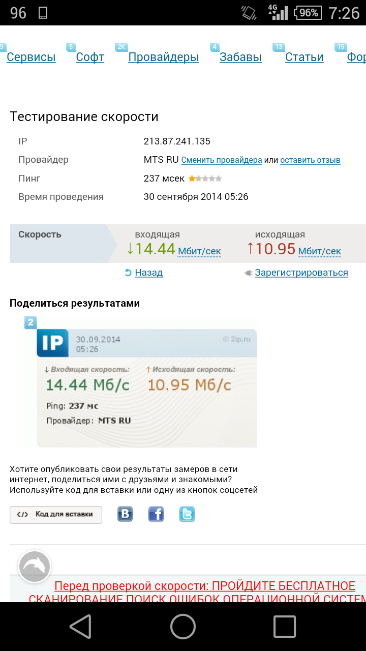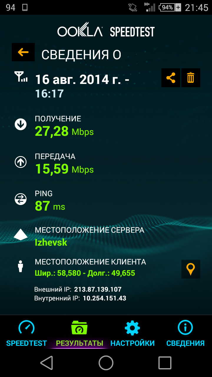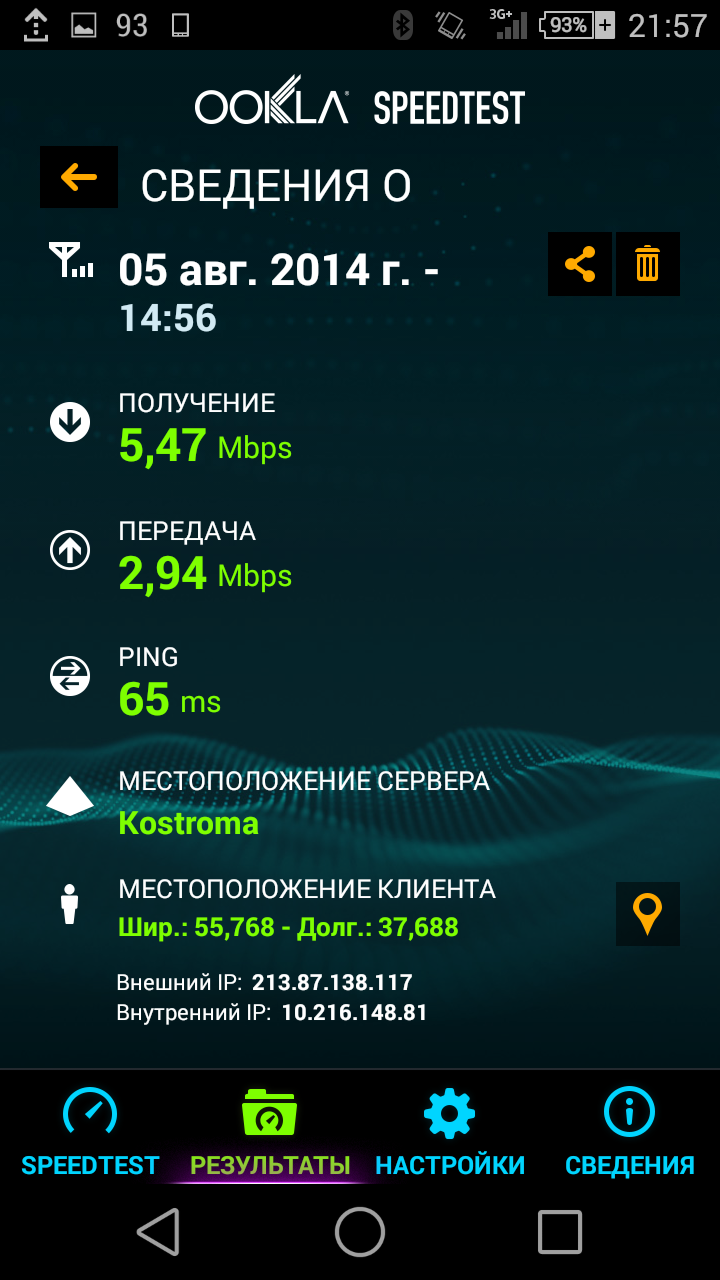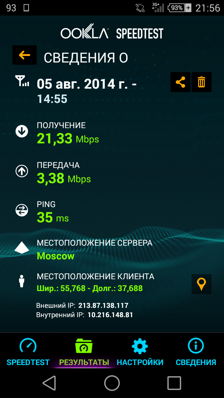 MadMonK Опубликовано 16 сентября, 2014 Опубликовано 16 сентября, 2014 Да про симку я у MadMonKа спрашивал, в порядке разбора низкой скорости Аналогично Газмастеру, зашел в ЦУМ, поменял на новую, выломал и пошел в Связной за смартом. Update Блин, наврал я тут немного, вот короче результат. Место действия - Киров. http://www.speedtest...ult/a/929632147 27,28 МБит/с на загрузку и 15,59 МБит/с в обратную сторону. В настройках приложения стояло kB/s, думал это килобиты, а оказалось калобайты. Внутри Москвы: http://www.speedtest...ult/a/916759594 Из Москвы в сторону Костромы: http://www.speedtest...ult/a/916760363