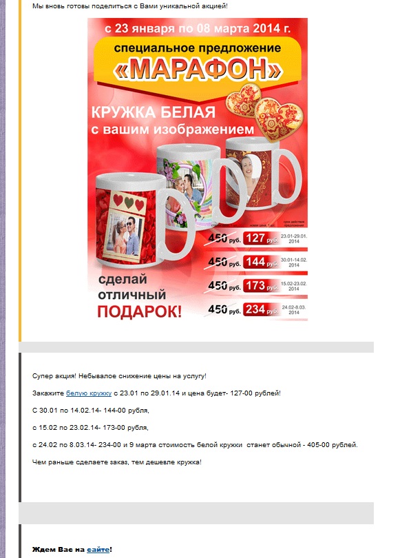 seven Опубликовано 24 января, 2014 Опубликовано 24 января, 2014 ага, девочки, про фотки за 3 рубля. цена на сайте почему-то не уменьшается.. сами посчитайте, и при получении заказа настаивайте, что заказ сделан в часы акции. как-то у нас такое было, фотки забирала мама, я отправила ей смс с номером заказа и суммой продавец спорить не стала.. от них вот ещё письмо пришло..