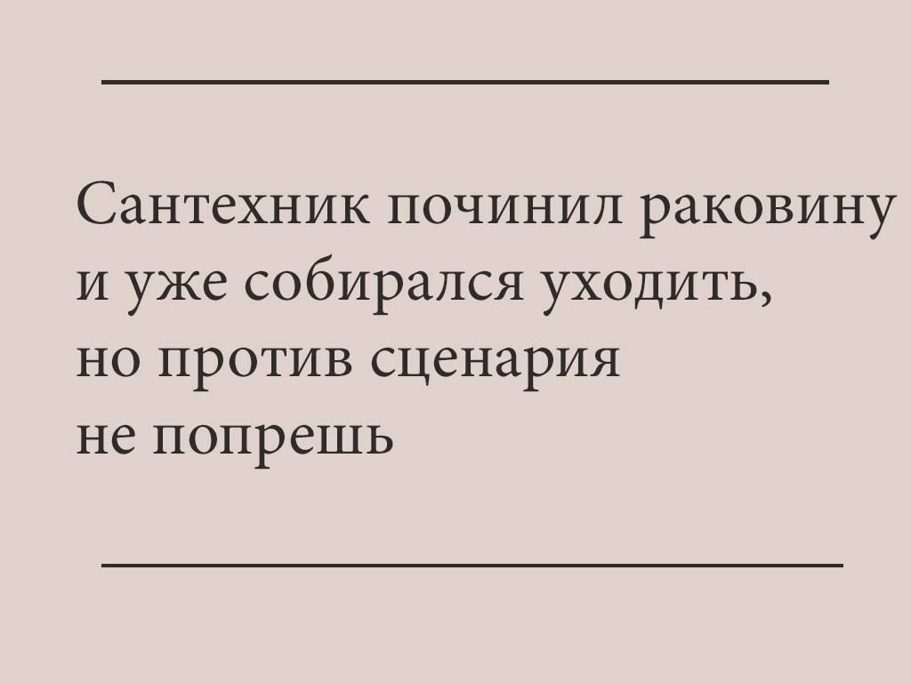 Румстер Опубликовано 16 июня, 2017 Опубликовано 16 июня, 2017 (изменено) Молодой человек приходит к врачу и говорит: — Доктор, у меня чрезмерная половая возбудимость, бывает, иду по улице, а он ни с того, ни с сего встанет, так неудобно от людей становится! — А вы привяжите его к ноге. Молодой человек уходит, но через несколько дней он звонит врачу и орет в трубку: — Ну вы и совет мне дали! Теперь по вашей милости меня привлекли за хулиганство! — А что, собственно, случилось? — Я шел по проспекту, а впереди в двух шагах от меня — симпатичная блондинка в мини—юбке. Вдруг она что—то уронила и нагнулась, чтобы поднять. А я, сам того не желая, дал ей под зад коленкой! *** Мужик приходит к хирургу и говорит: — Укоротите мне член, а то он по земле волочится. Хирург говорит: — Без проблем. Подготовили мужика к операции, дали наркоз и вдруг вспомнили, что забыли спросить какой длины оставить член. Доктор спрашивает у старшей сестры — она показала длину около 20 сантиметров, более молодая — около 30 сантиметров, а практикантка спросила: — Доктор, а нельзя ли удлинить ему ноги Изменено 16 июня, 2017 пользователем Румстер