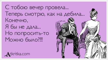 autor59 Опубликовано 27 ноября, 2015 Опубликовано 27 ноября, 2015 (изменено) "- На кой? Чтоб меня тоже из дома выгнали?" © :) ну так потом же пустили))) — Хватит! Хватит Бл""ть! - кричала девушка в маршрутке, забыв слово — ОСТАНОВИТЕ..! Изменено 27 ноября, 2015 пользователем autor59