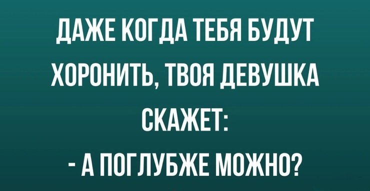 Румстер Опубликовано 12 декабря, 2023 Опубликовано 12 декабря, 2023 Бомж собрался вешаться, жизнь г-но, ничего нет, тут появляется черт: — Cлушай, мужик, давай сделку заключим, я тебе дам все, но через 10 лет я забираю твою душу. Бомж соглашается, терять нечего. Десять лет живет шикарно, жена красавица, двое ребятишек, отличная работа, квартира, машина и прочие прелести. Он уже забыл про черта, тут он появляется: — Ну все мужик, собирайся. — Дай денек, с родными попрощаться. — Хорошо завтра утром приду за тобой. Мужик приходит домой, со всеми прощается, жена в недоумении, отводит в сторону мужа. Тот ей все рассказывает, как есть. Жена говорит иди мол спать ложись, утром решим что-нибудь. Утром заявляется черт: — Ну все, мужик пошли. В комнату входит жена: — Погоди, рогатенький, ты же всемогущий? — Ну конечно да. — Давай заключим сделку, выполнишь мои три желания, заберешь души моего мужа, мою и моих детей, а не выполнишь, уберешься ни с чем. Черт соглашается. Жена: — (пукает) Лови! Черт головой мотает: — Что ловить, где ловить? Жена: — Про***л первое желание, второе желание (выдергивает волос из п***ды) — ровняй. Черт и так и сяк, не выравнивается. Жена: — Про***л второе желание. Я тут вчера на дачу ездила, пошла по воду, а калитку заклинило, через забор перелазила и порвала между ног, третье желание — залижи рану. Ложится на кровать, черт давай рану зализывать. Час, два, три, жена уже на 7 небе от счастья, расслабилась и опять пердит… Черт: — Да ну вас на ***й, тут зализываешь, там рвется. 1