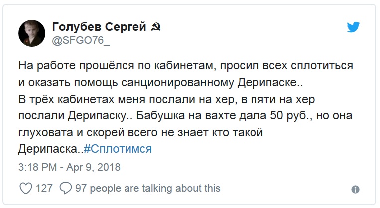 Koltrain Опубликовано 10 апреля, 2018 Опубликовано 10 апреля, 2018 Успокойтесь. Никто из вас никому ничего не оплатил. Не льстите себе и портите свою печень.