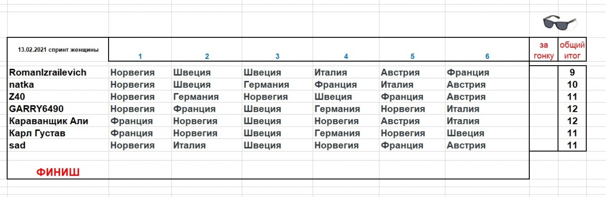 Z40 Опубликовано 13 февраля, 2021 Опубликовано 13 февраля, 2021 16 минут назад, natka сказал(а) : Норвегия(Экхофф) - Швеция (Х.Эберг) - Германия (Херманн) Кудряшка промахнется, а выиграет немка))) ЗЫ. По фамилиям конечно было бы более обьективно гадать.