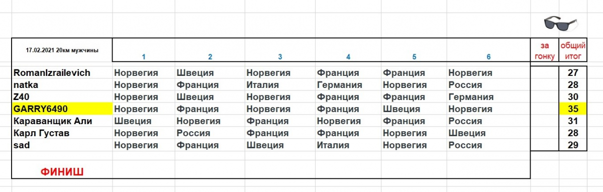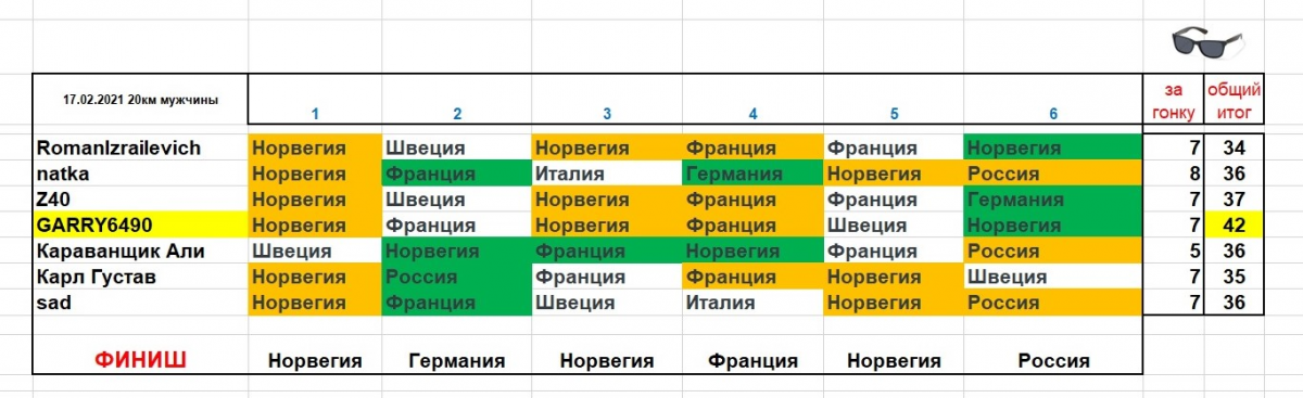 RomanIzrailevich Опубликовано 17 февраля, 2021 Автор Опубликовано 17 февраля, 2021 Норвегия - Швеция - Норвегия - Франция - Франция - Норвегия
