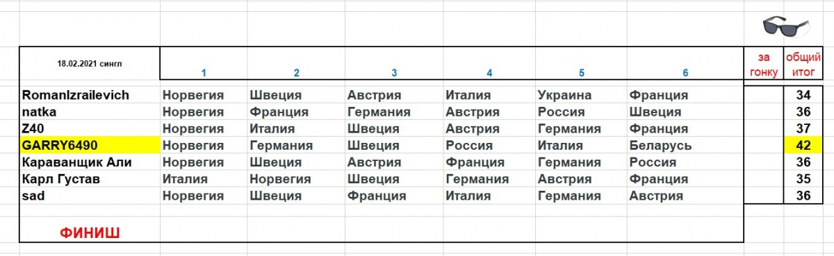 RomanIzrailevich Опубликовано 18 февраля, 2021 Автор Опубликовано 18 февраля, 2021 Итого 1. надо же - я всю шестерку правильно угадал, но ни одного точного совпадения) 2. Карл молодец в этой гонке 3. удивлен Натке - как она своей любимице Доро не доверила попасть в шестерку 4. как так то - Гарри угадал всех меньше, но очков набрал достаточно. Опять в желтом) 5. Завтра выходной))