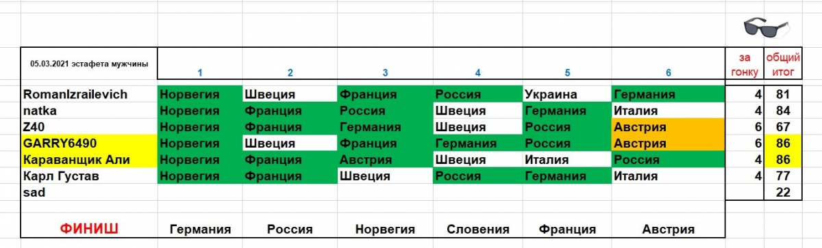 RomanIzrailevich Опубликовано 5 марта, 2021 Автор Опубликовано 5 марта, 2021 итого Два спорщика делят лидерское место. Оставим разборки на последнюю эстафету (2+2). С них первые/одновременные прогнозы
