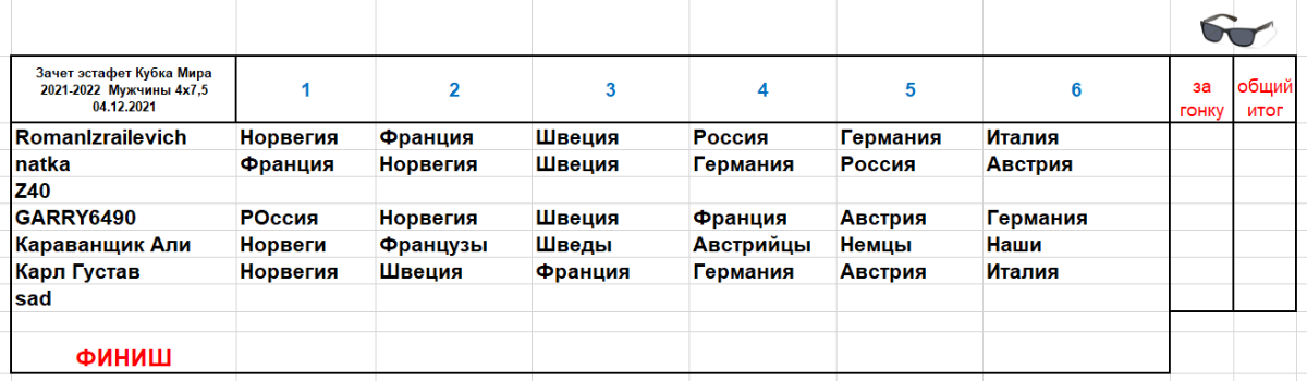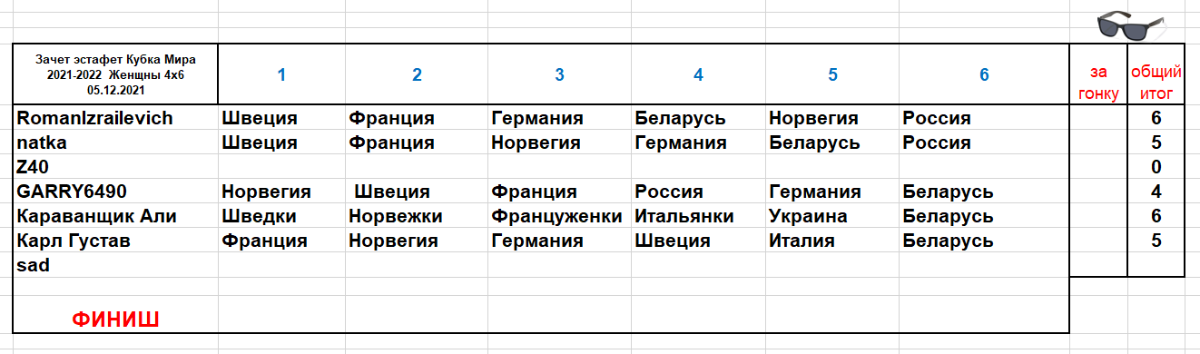 RomanIzrailevich Опубликовано 4 декабря, 2021 Автор Опубликовано 4 декабря, 2021 Эстафеты М Норвегия Франция Швеция Россия Германия Италия Ж Швеция Франция Германия Беларусь Норвегия Россия