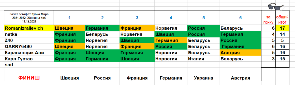 GARRY6490 Опубликовано 11 декабря, 2021 Опубликовано 11 декабря, 2021 А вот и мну Ж - Швеция, Норвегия, Франция, Россия, Беларусь, Германия
